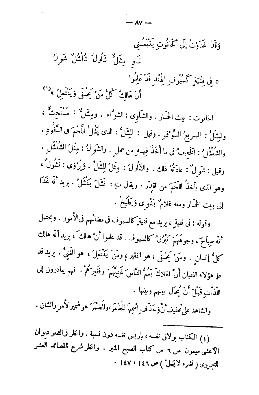 وقد غدوتُ إلى الحانوتِ يتبعُني ... شاوٍ مِشُلُّ شَلولُ شُلشُلُ شَوِلُ