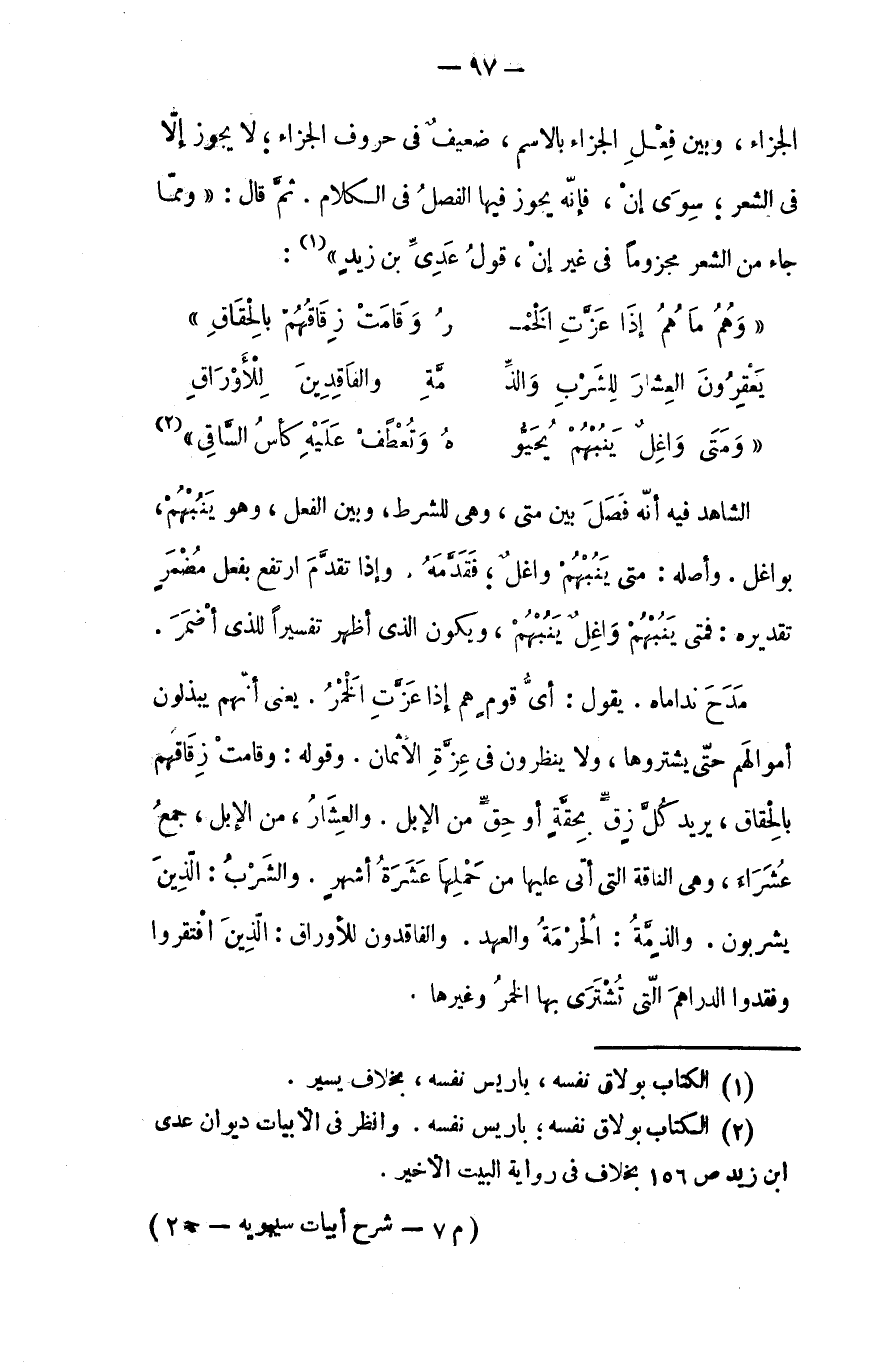 الجزاءْ وبين فعل الجزاء بالاسم ضعيف في حروف الجزاء، لا يجوز إلا في الشعر. سوى (إنْ) فإنه يجوز فيها الفصل في الكلام. ثم قال: ومما جاء من الشعر مجزوماً في غير (إنْ) قول عدي بن زيد: