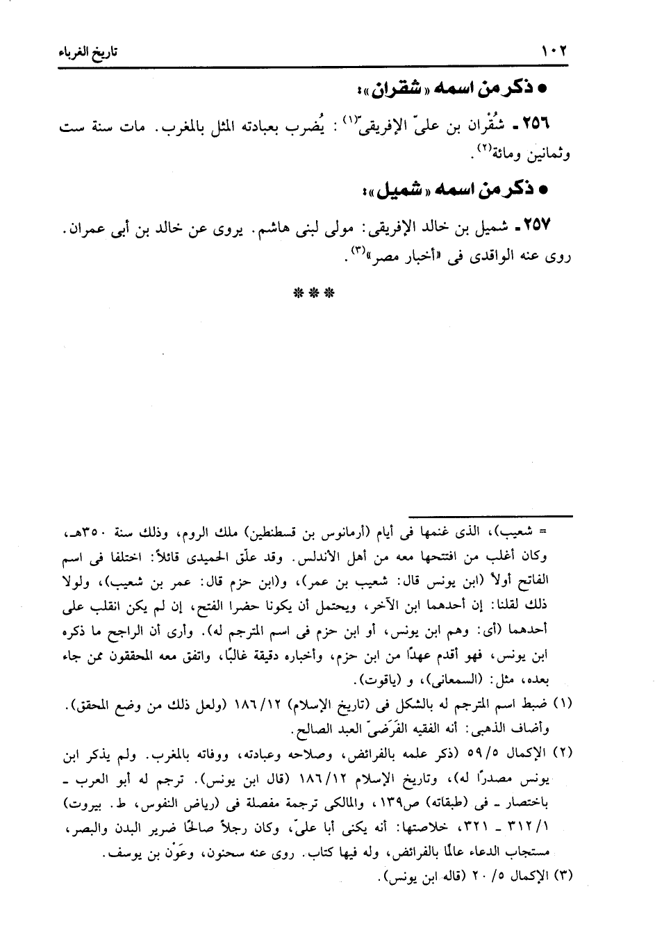 256- شقران بن علىّ الإفريقىّ «1» : يضرب بعبادته المثل بالمغرب. مات سنة ست وثمانين ومائة «2» .