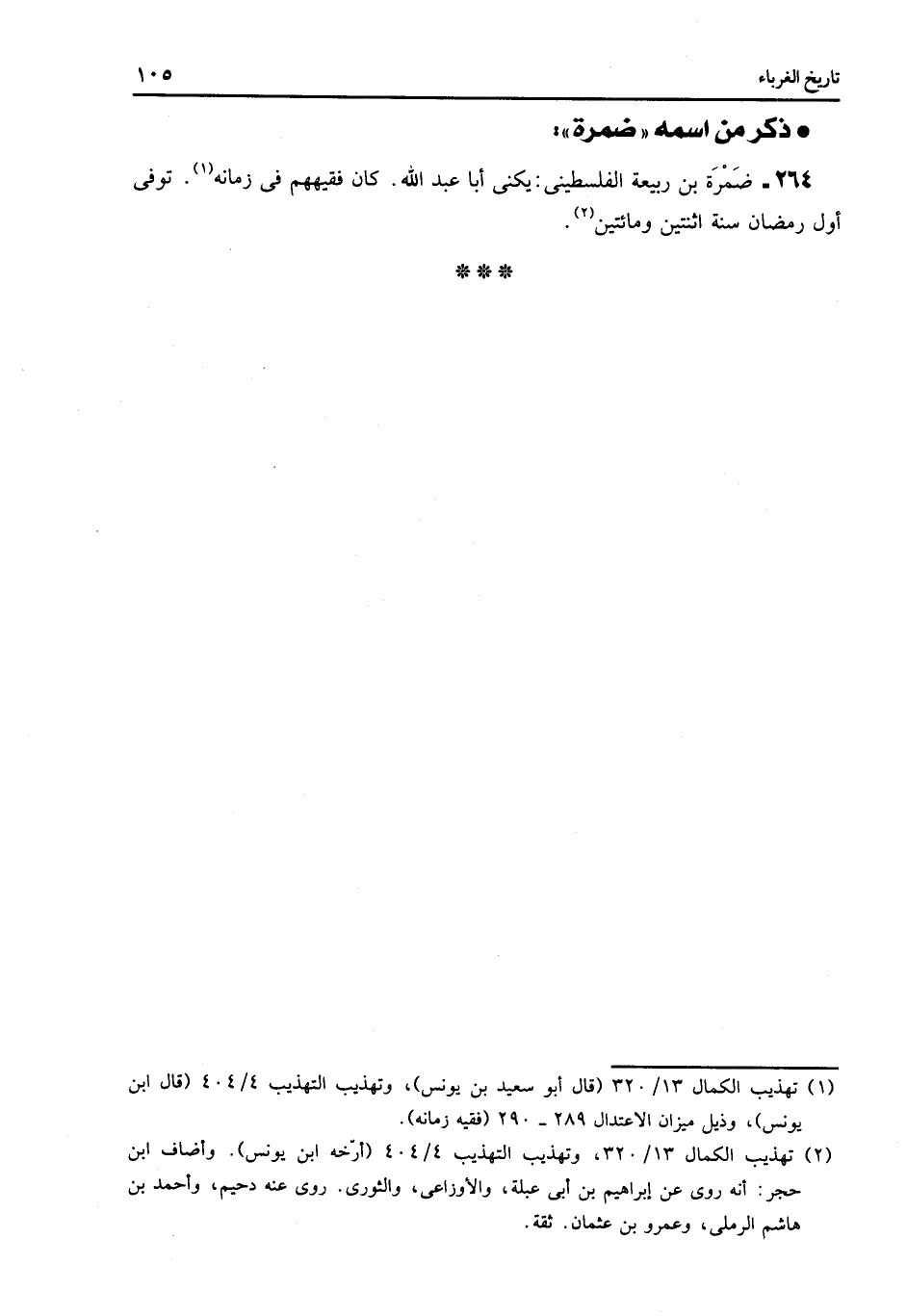 264- ضمرة بن ربيعة الفلسطينى: يكنى أبا عبد الله. كان فقيههم فى زمانه «1» . توفى أول رمضان سنة اثنتين ومائتين «2» .