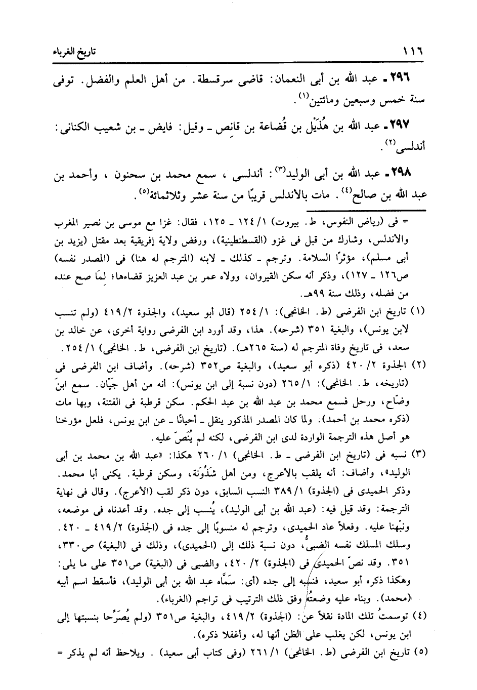 296- عبد الله بن أبى النعمان: قاضى سرقسطة. من أهل العلم والفضل. توفى سنة خمس وسبعين ومائتين «1» .
