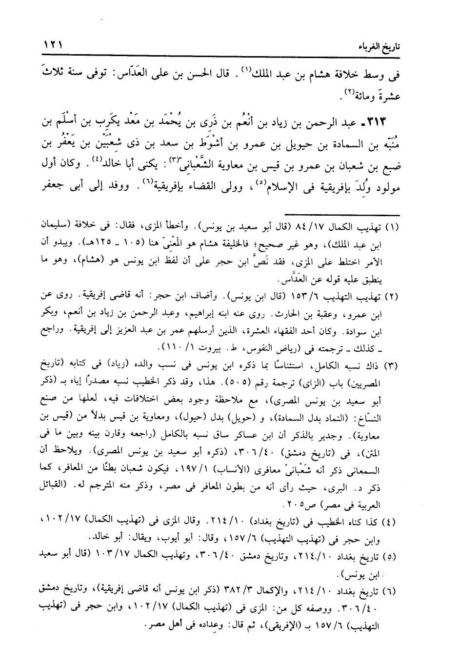 313- عبد الرحمن بن زياد بن أنعم بن ذرى بن يحمد بن معد يكرب بن أسلم بن منبّه بن السمادة بن حيويل بن عمرو بن أشوط بن سعد بن ذى شعبين بن يعفر بن ضبع بن شعبان بن عمرو بن قيس بن معاوية الشّعبانىّ «3» : يكنى أبا خالد «4» . وكان أول مولود ولد بإفريقية فى الإسلام «5» ، وولى القضاء بإفريقية «6» . ووفد إلى أبى جعفر