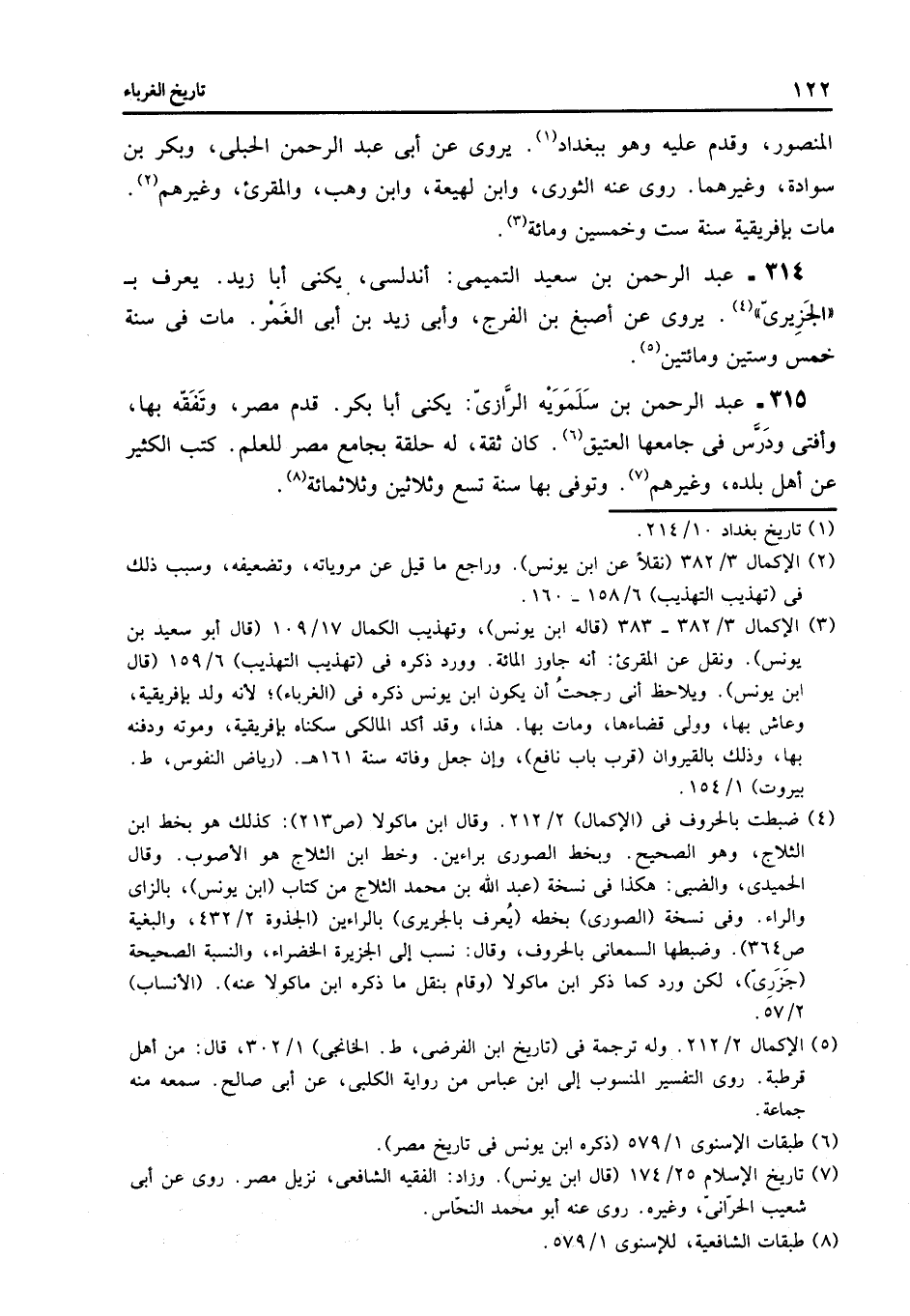 315- عبد الرحمن بن سلمويه الرّازىّ: يكنى أبا بكر. قدم مصر، وتفقّه بها، وأفتى ودرّس فى جامعها العتيق «6» . كان ثقة، له حلقة بجامع مصر للعلم. كتب الكثير عن أهل بلده، وغيرهم «7» . وتوفى بها سنة تسع وثلاثين وثلاثمائة «8» .