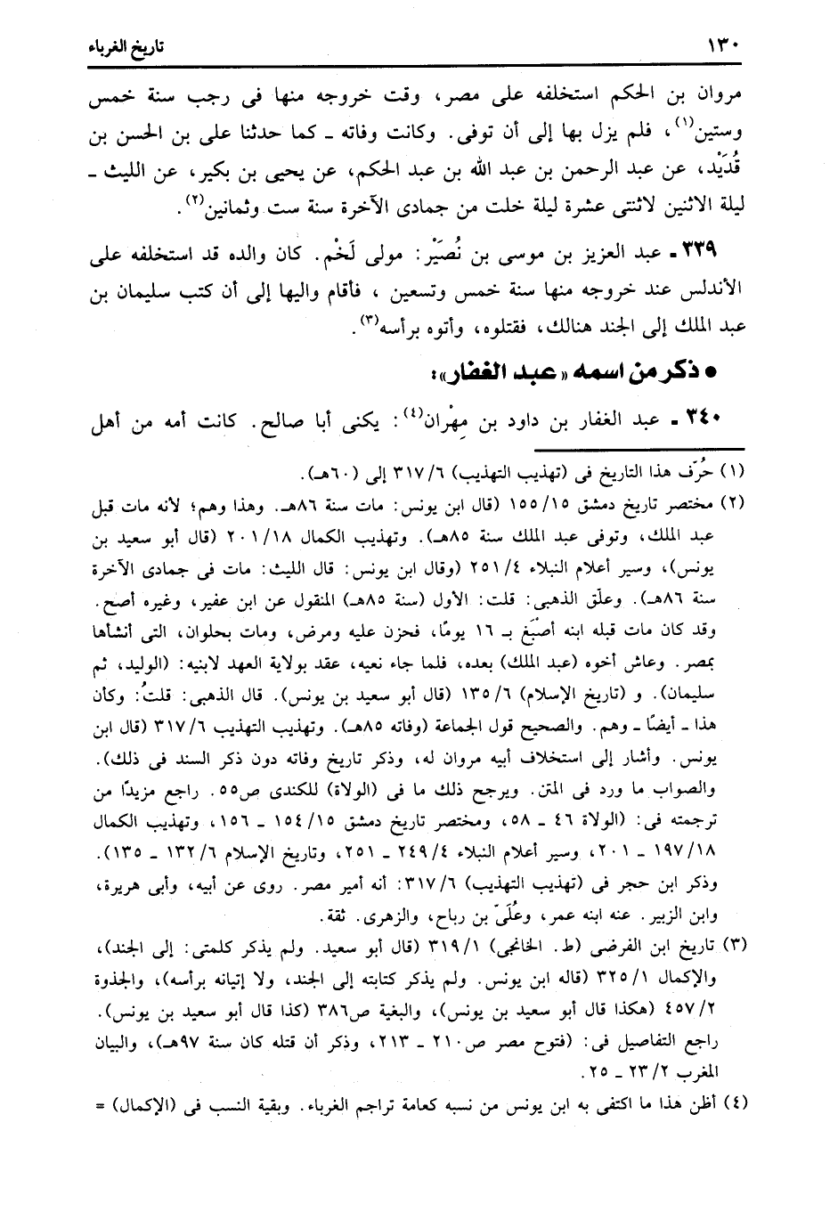 339- عبد العزيز بن موسى بن نصير: مولى لخم. كان والده قد استخلفه على الأندلس عند خروجه منها سنة خمس وتسعين، فأقام واليها إلى أن كتب سليمان بن عبد الملك إلى الجند هنالك، فقتلوه، وأتوه برأسه «3» .