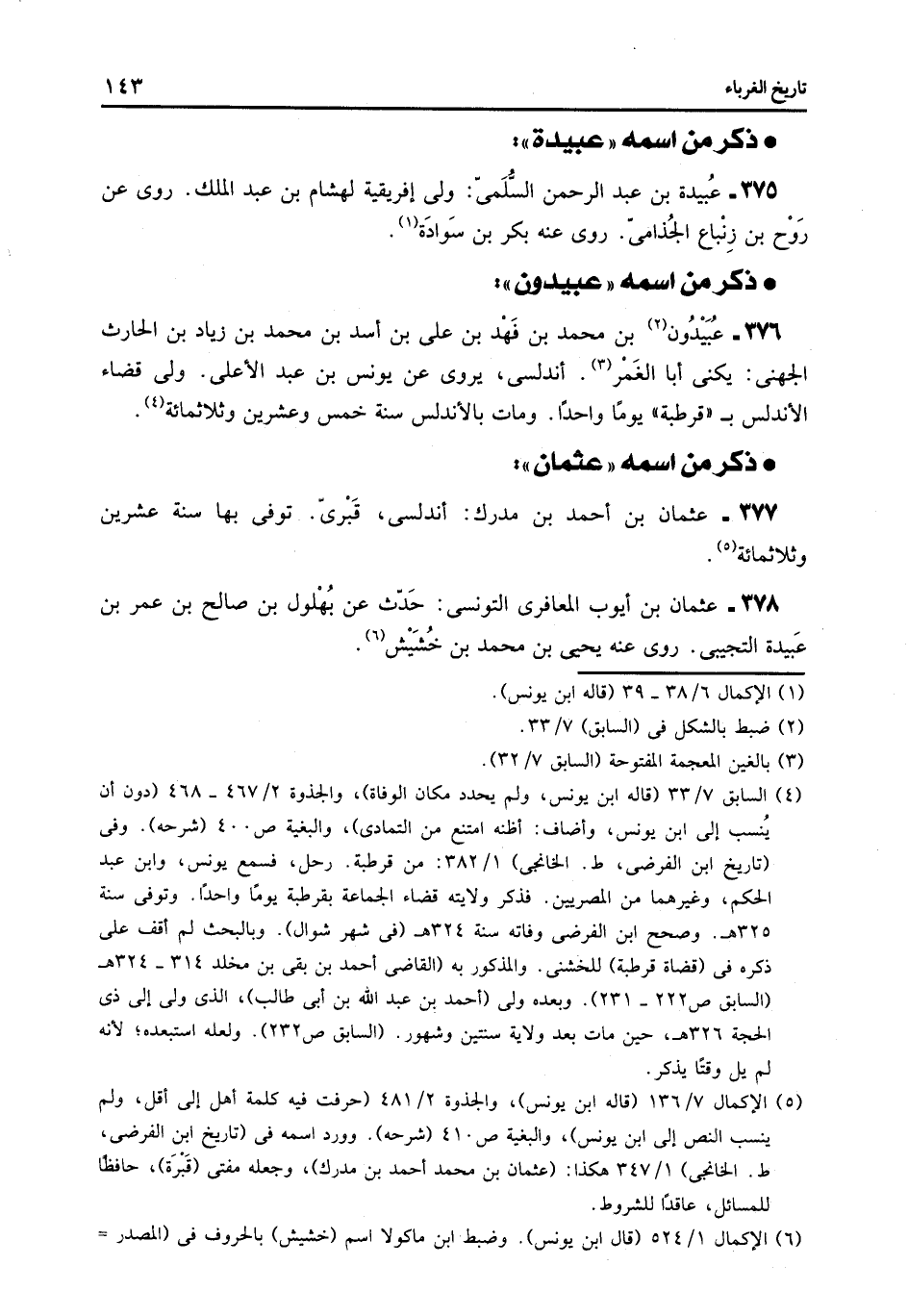 376- عبيدون «2» بن محمد بن فهد بن على بن أسد بن محمد بن زياد بن الحارث الجهنى: يكنى أبا الغمر «3» . أندلسى، يروى عن يونس بن عبد الأعلى. ولى قضاء الأندلسى ب «قرطبة» يوما واحدا. ومات بالأندلس سنة خمس وعشرين وثلاثمائة «4» .