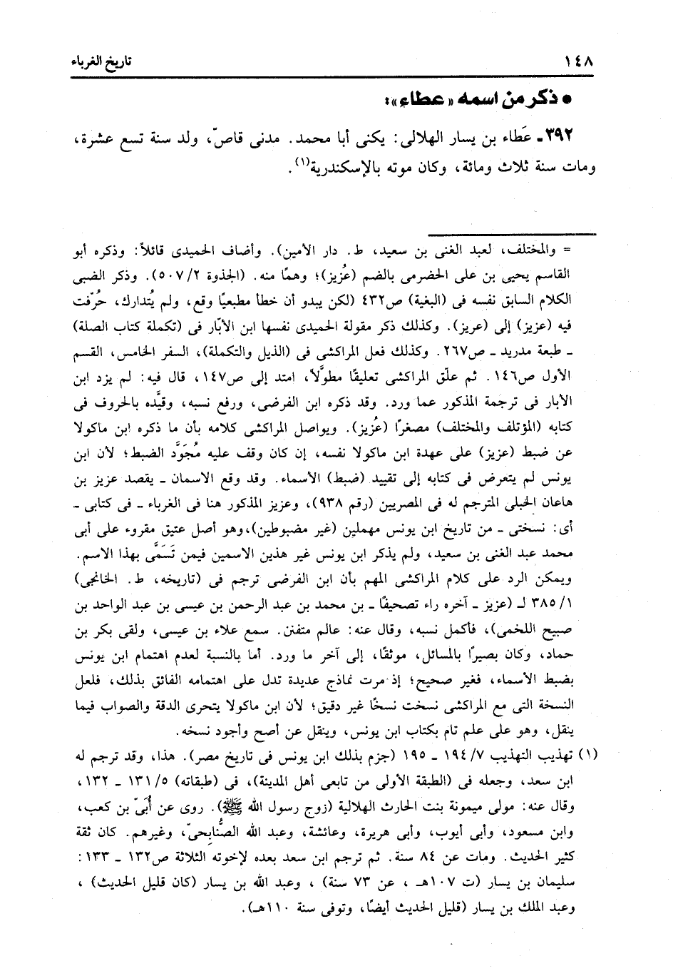 392- عطاء بن يسار الهلالى: يكنى أبا محمد. مدنى قاصّ، ولد سنة تسع عشرة، ومات سنة ثلاث ومائة، وكان موته بالإسكندرية «1» .
