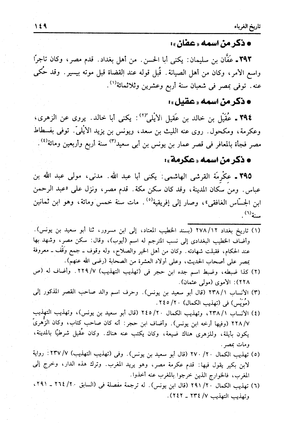 393- عفّان بن سليمان: يكنى أبا الحسن. من أهل بغداد. قدم مصر، وكان تاجرا واسع الأمر، وكان من أهل الصيانة. قبل قوله عند القضاة قبل موته بيسير. وقد حكى عنه. توفى بمصر فى شعبان سنة أربع وعشرين وثلاثمائة «1» .