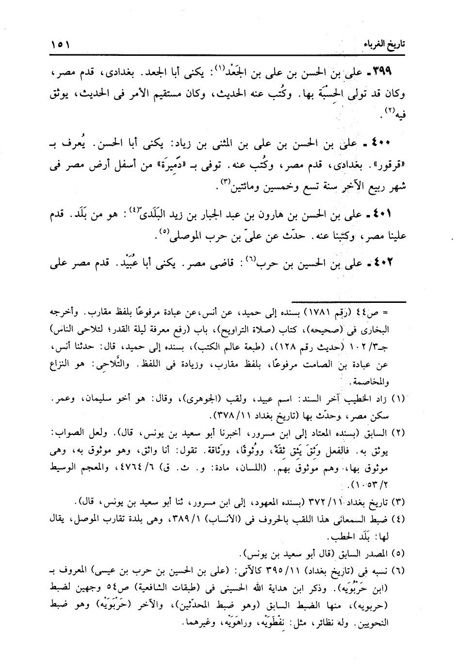 401- على بن الحسن بن هارون بن عبد الجبار بن زيد البلدىّ «4» : هو من بلد. قدم علينا مصر، وكتبنا عنه. حدّث عن علىّ بن حرب الموصلى «5» .