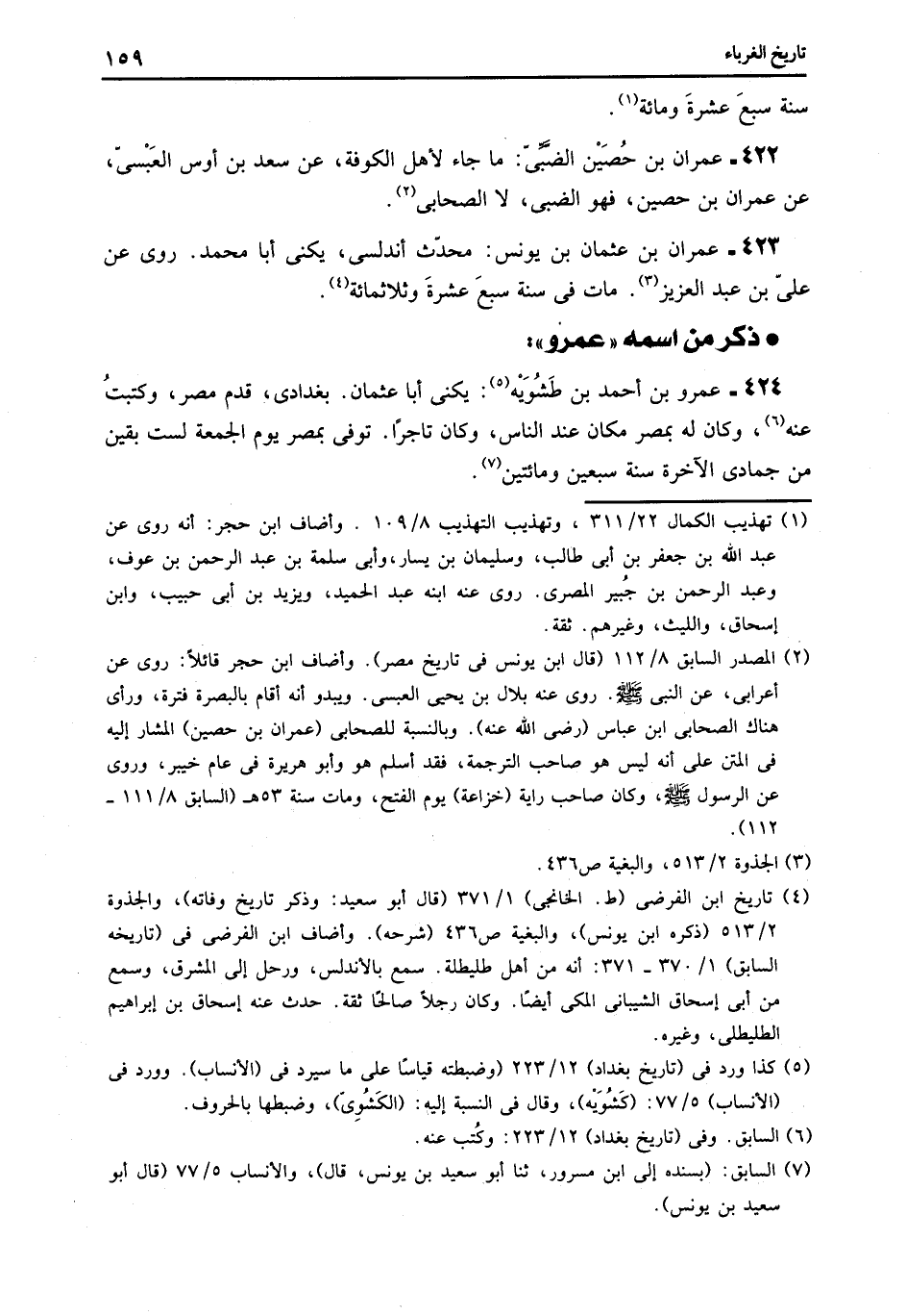 422- عمران بن حصين الضّبّىّ: ما جاء لأهل الكوفة، عن سعد بن أوس العبسىّ، عن عمران بن حصين، فهو الضبى، لا الصحابى «2» .
