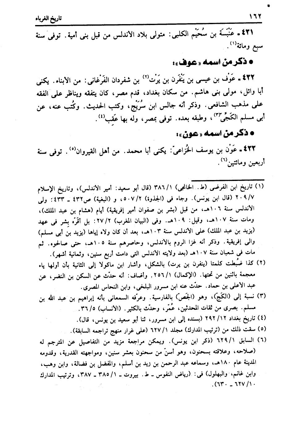 433- عون بن يوسف الخزاعىّ: يكنى أبا محمد. من أهل القيروان «5» . توفى سنة أربعين ومائتين «6» .