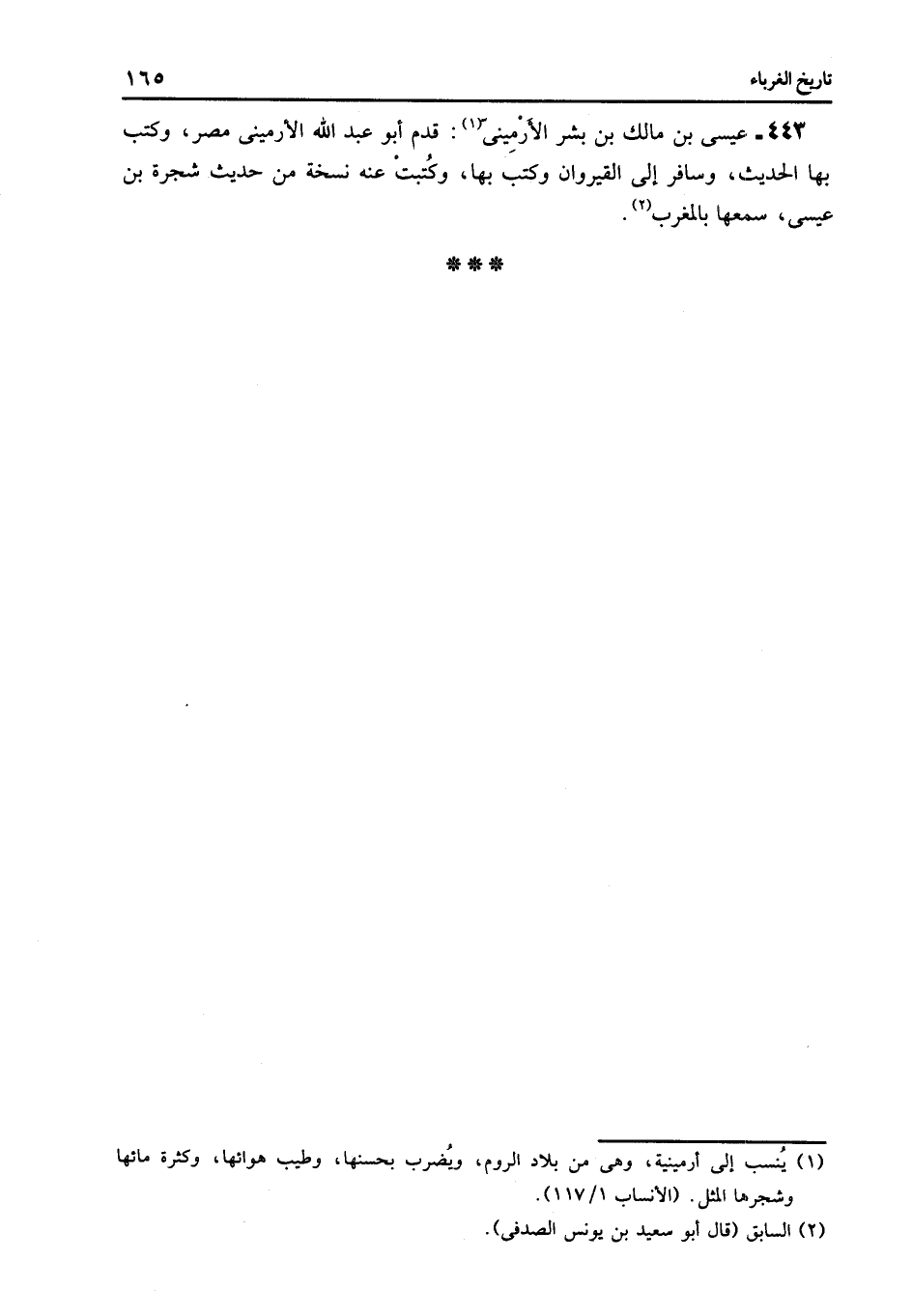 443- عيسى بن مالك بن بشر الأرمينىّ «1» : قدم أبو عبد الله الأرمينى مصر، وكتب بها الحديث، وسافر إلى القيروان وكتب بها، وكتبت عنه نسخة من حديث شجرة بن عيسى، سمعها بالمغرب «2» .