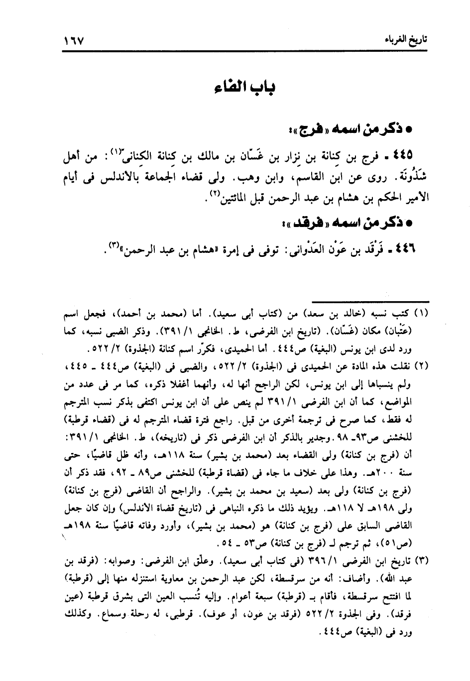 445- فرج بن كنانة بن نزار بن غسّان بن مالك بن كنانة الكنانىّ «1» : من أهل شذونة. روى عن ابن القاسم، وابن وهب. ولى قضاء الجماعة بالأندلس فى أيام الأمير الحكم بن هشام بن عبد الرحمن قبل المائتين «2» .