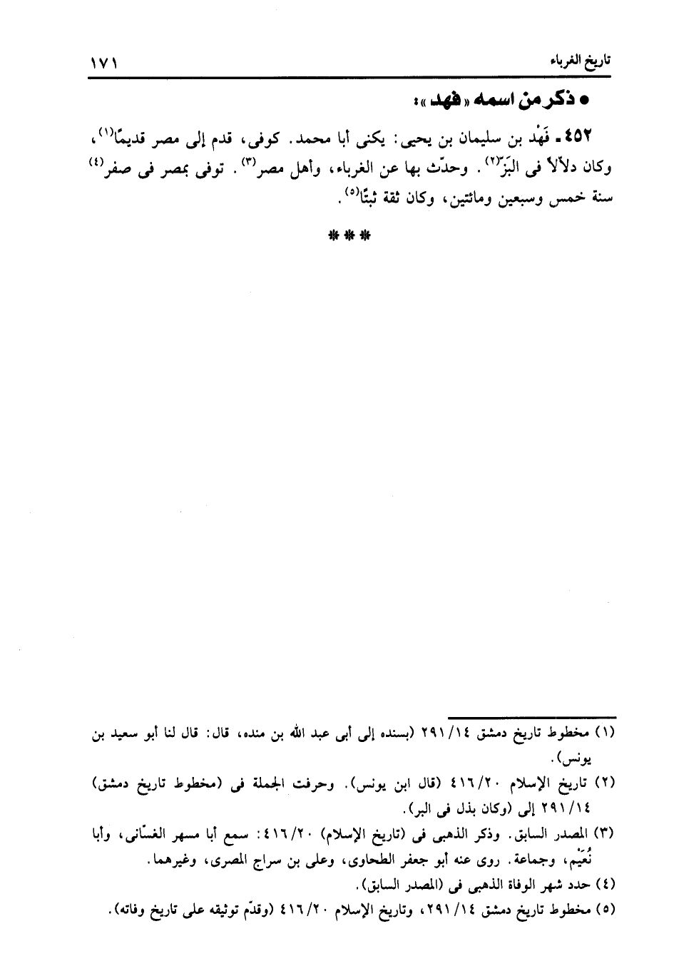452- فهد بن سليمان بن يحيى: يكنى أبا محمد. كوفى، قدم إلى مصر قديما «1» ، وكان دلّالا فى البزّ «2» . وحدّث بها عن الغرباء، وأهل مصر «3» . توفى بمصر فى صفر «4» سنة خمس وسبعين ومائتين، وكان ثقة ثبتا «5» .