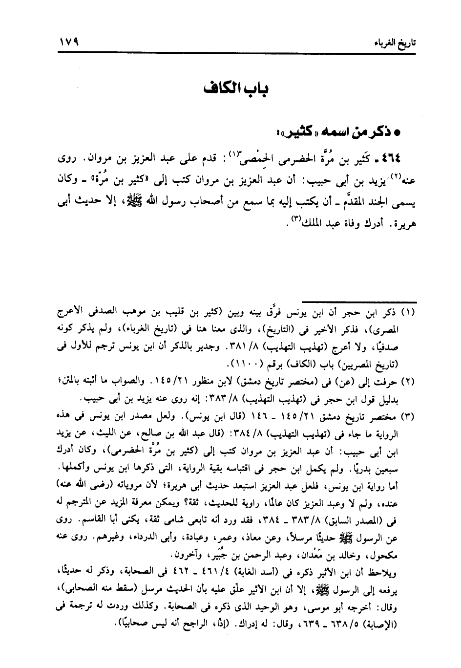 464- كثير بن مرّة الحضرمى الحمصىّ «1» : قدم على عبد العزيز بن مروان. روى عنه «2» يزيد بن أبى حبيب: أن عبد العزيز بن مروان كتب إلى «كثير بن مرّة» - وكان يسمى الجند المقدّم- أن يكتب إليه بما سمع من أصحاب رسول الله صلى الله عليه وسلم، إلا حديث أبى هريرة. أدرك وفاة عبد الملك «3» .