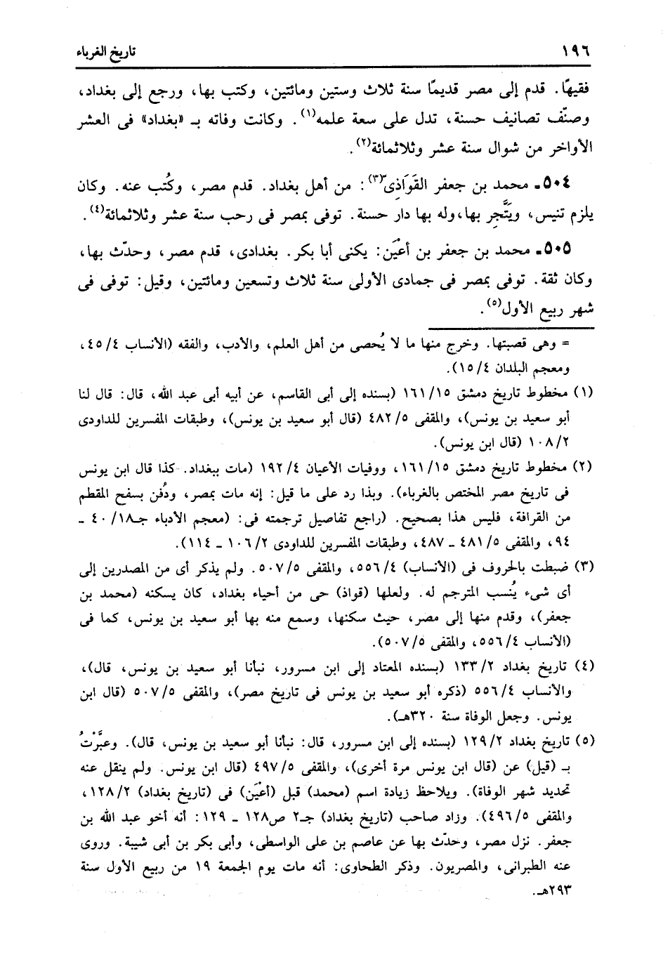 504- محمد بن جعفر القواذىّ «3» : من أهل بغداد. قدم مصر، وكتب عنه. وكان يلزم تنيس، ويتّجر بها، وله بها دار حسنة. توفى بمصر فى رجب سنة عشر وثلاثمائة «4» .