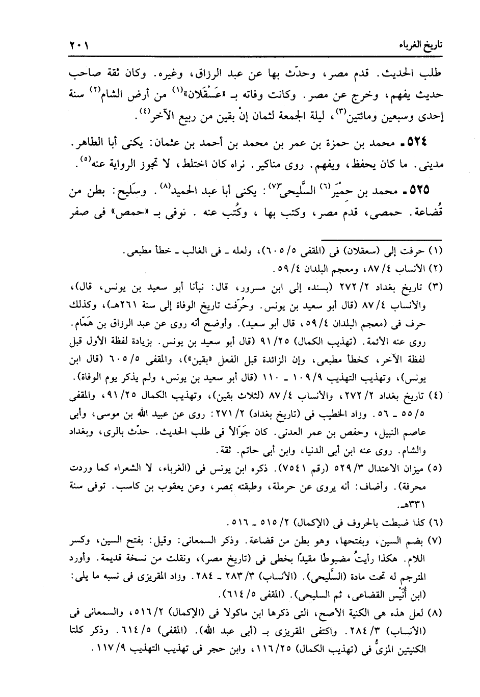 525- محمد بن حمير «6» السّليحىّ «7» : يكنى أبا عبد الحميد «8» . وسليح: بطن من قضاعة. حمصى، قدم مصر، وكتب بها، وكتب عنه. نوفى ب «حمص» فى صفر