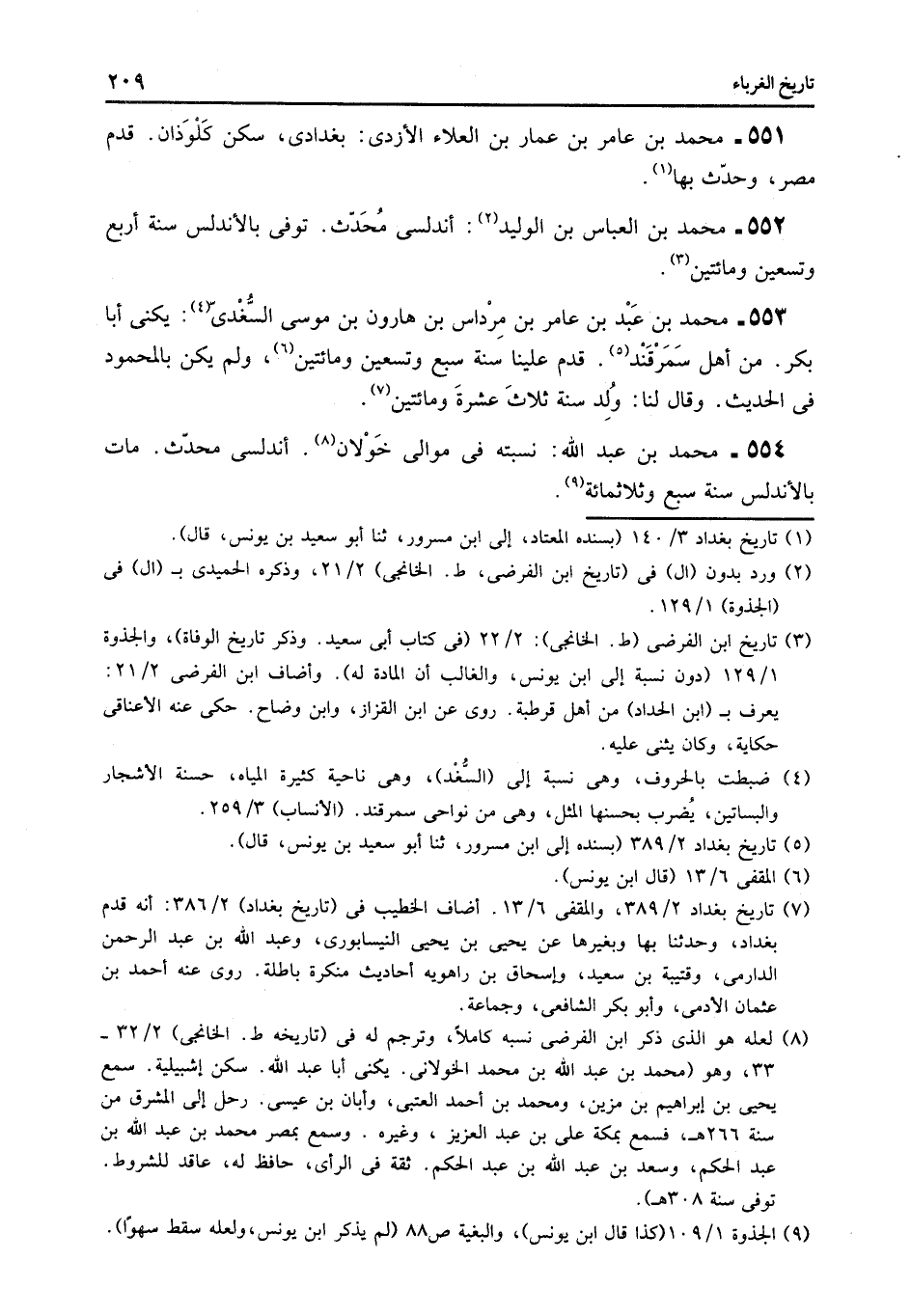 553- محمد بن عبد بن عامر بن مرداس بن هارون بن موسى السّغدىّ «4» : يكنى أبا بكر. من أهل سمرقند «5» . قدم علينا سنة سبع وتسعين ومائتين «6» ، ولم يكن بالمحمود فى الحديث. وقال لنا: ولد سنة ثلاث عشرة ومائتين «7» .