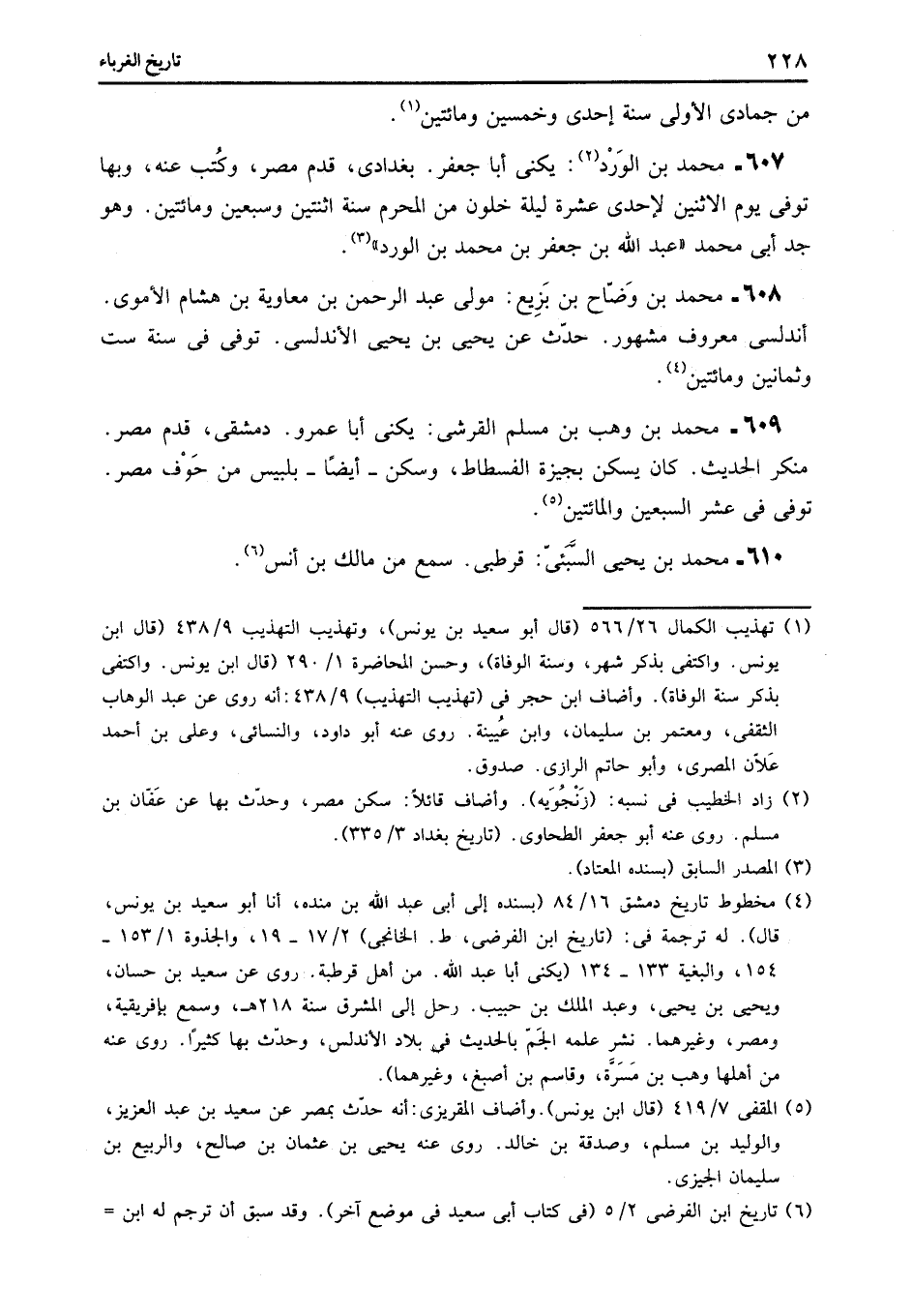 607- محمد بن الورد «2» : يكنى أبا جعفر. بغدادى، قدم مصر، وكتب عنه، وبها توفى يوم الاثنين لإحدى عشرة ليلة خلون من المحرم سنة اثنتين وسبعين ومائتين. وهو جد أبى محمد «عبد الله بن جعفر بن محمد بن الورد» «3» .
