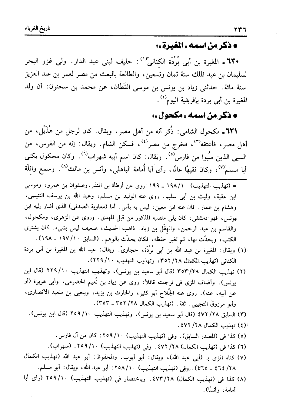 631- مكحول الشامى: ذكر أنه من أهل مصر، ويقال: كان لرجل من هذيل، من أهل مصر، فأعتقه «3» ، فخرج من مصر «4» ، فسكن الشام. ويقال: إنه من الفرس، من السبى الذين سبوا من فارس «5» . ويقال: كان اسم أبيه شهراب «6» . وكان مكحول يكنى أبا مسلم «7» ، وكان فقيها عالما، رأى أبا أمامة الباهلى، وأنس بن مالك «8» . وسمع واثلة