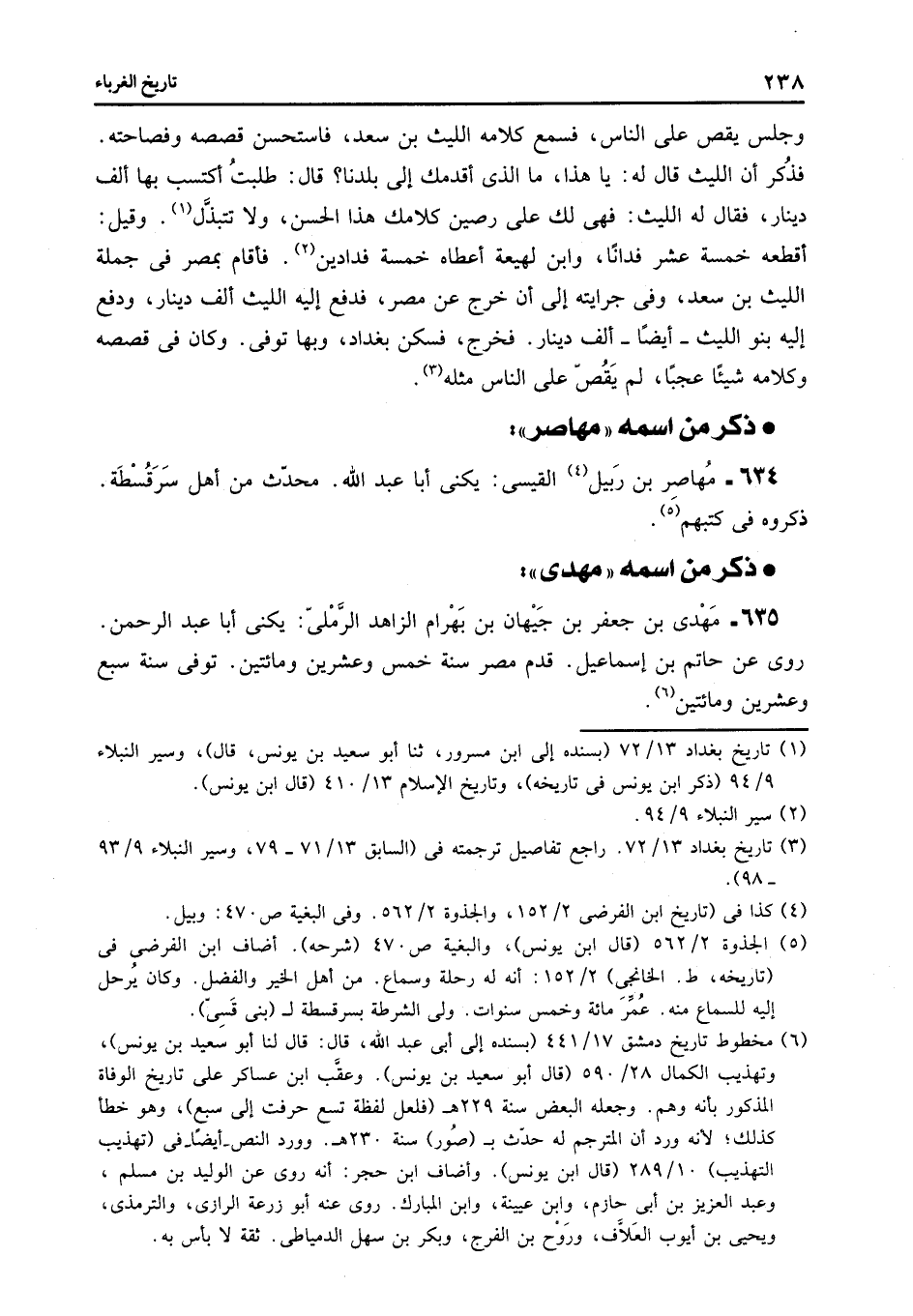 أقطعه خمسة عشر فدانا، وابن لهيعة أعطاه خمسة فدادين «2» . فأقام بمصر فى جملة الليث بن سعد، وفى جرايته إلى أن خرج عن مصر، فدفع إليه الليث ألف دينار، ودفع إليه بنو الليث- أيضا- ألف دينار. فخرج، فسكن بغداد، وبها توفى. وكان فى قصصه وكلامه شيئا عجبا، لم يقصّ على الناس مثله «3» .