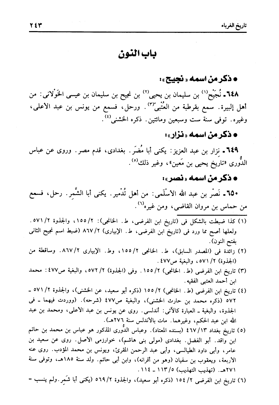 649- نزار بن عبد العزيز: يكنى أبا مضر. بغدادى، قدم مصر. وروى عن عباس الدّورى «تاريخ يحيى بن معين» ، وغير ذلك «5» .
