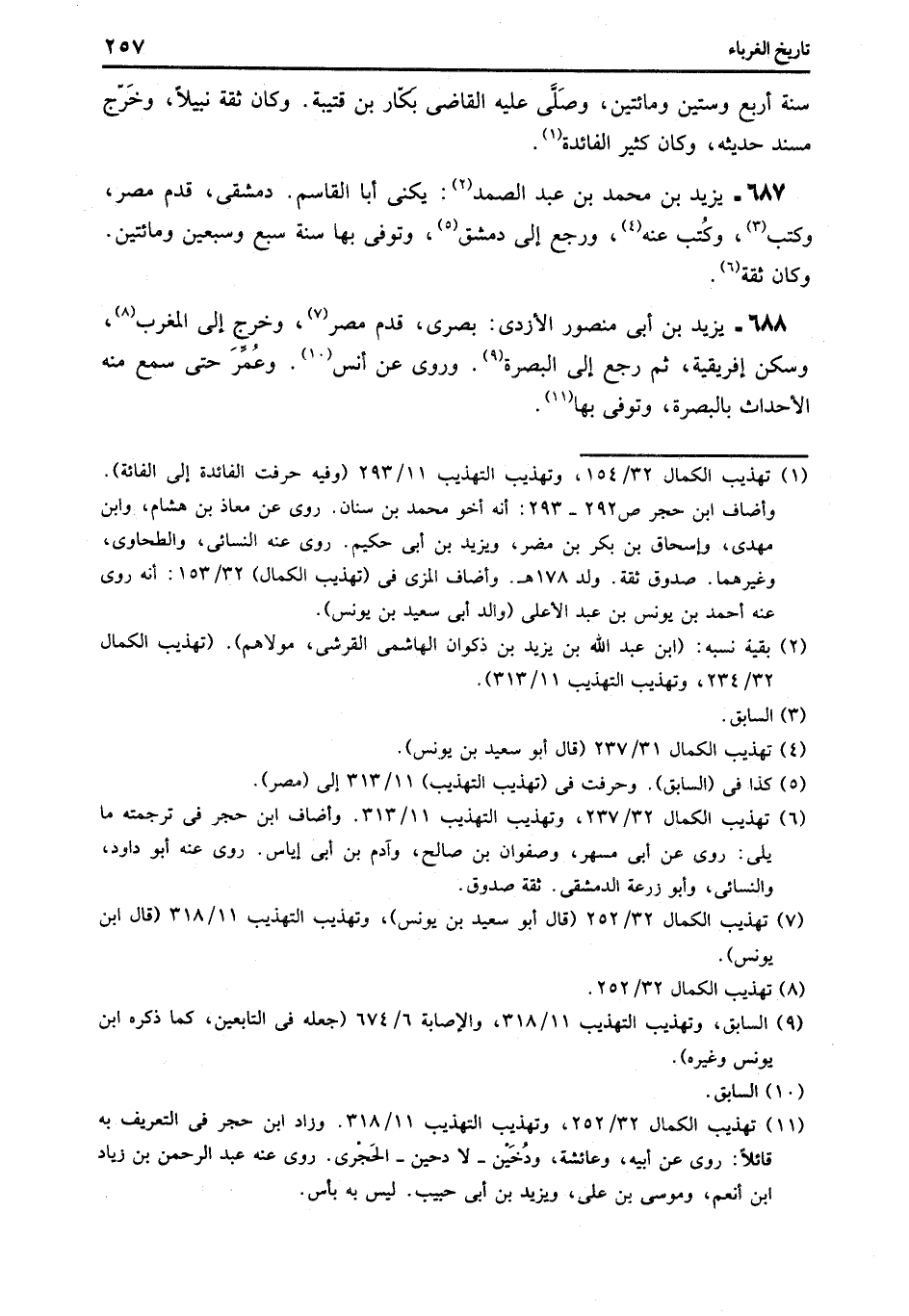 687- يزيد بن محمد بن عبد الصمد «2» : يكنى أبا القاسم. دمشقى، قدم مصر، وكتب «3» ، وكتب عنه «4» ، ورجع إلى دمشق «5» ، وتوفى بها سنة سبع وسبعين ومائتين.