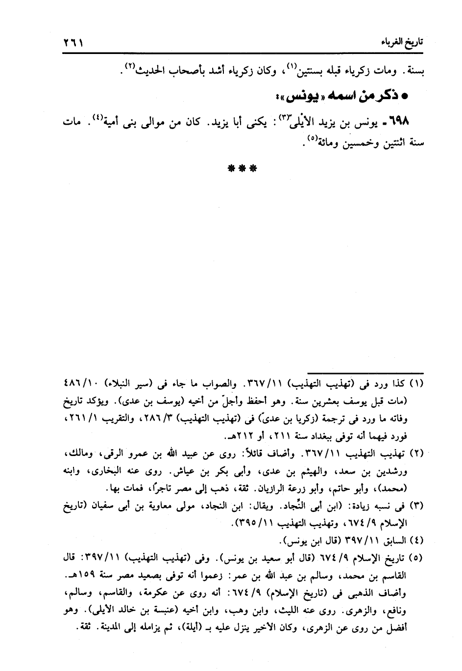 698- يونس بن يزيد الأيلىّ «3» : يكنى أبا يزيد. كان من موالى بنى أمية «4» . مات سنة اثنتين وخمسين ومائة «5» .