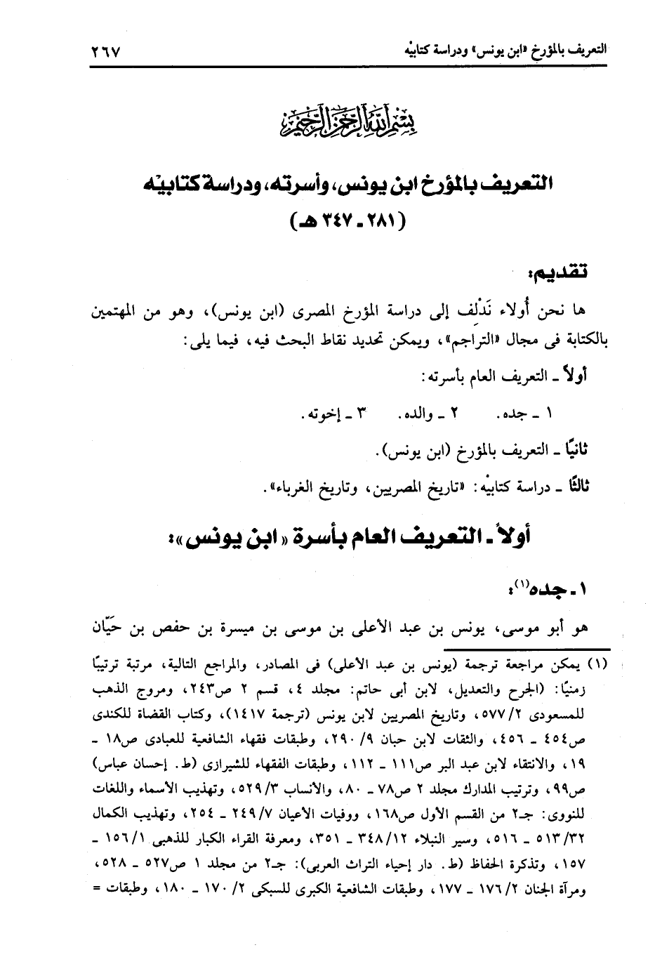التعريف بالمؤرخ ابن يونس، وأسرته، ودراسة كتابيه (281- 347 هـ)
