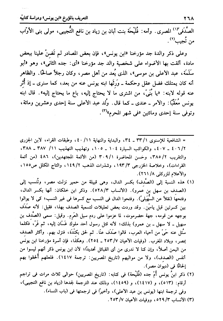 وعلى ذكر والدة جد مؤرخنا «ابن يونس» ، فإن بعض المصادر لم تضن علينا ببعض مادة، ألقت بها الأضواء على شخصية والد جد مؤرخنا «أى: جده الثانى» ، وهو «أبو سلمة، عبد الأعلى بن موسى» ، الذي يعد من أهل مصر، وكان رجلا صالحا. والظاهر أنه كان يمتلك فضل عقل وحكمة- ورثها ابنه يونس عنه من بعد، كما سنرى- إذ أثر عنه قوله لابنه: «يا بنىّ، من اشترى ما لا يحتاج إليه، باع ما يحتاج إليه» . قال ابنه يونس معقّبا: والأمر- عندى- كما قال. ولد عبد الأعلى سنة إحدى وعشرين ومائة، وتوفى سنة إحدى ومائتين «فى شهر المحرم» «3» .