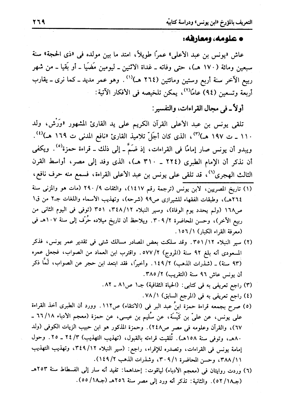 ويبدو أن يونس صار إماما فى القراءات، إذ ضمّ- إلى ذلك- قراءة حمزة «5» . ويكفى أن نذكر أن الإمام الطبرى (224- 310 هـ) ، الذي وفد إلى مصر، أواسط القرن الثالث الهجرى «6» ، قد تلقى على يونس بن عبد الأعلى القراءة، فسمع منه حرف نافع،