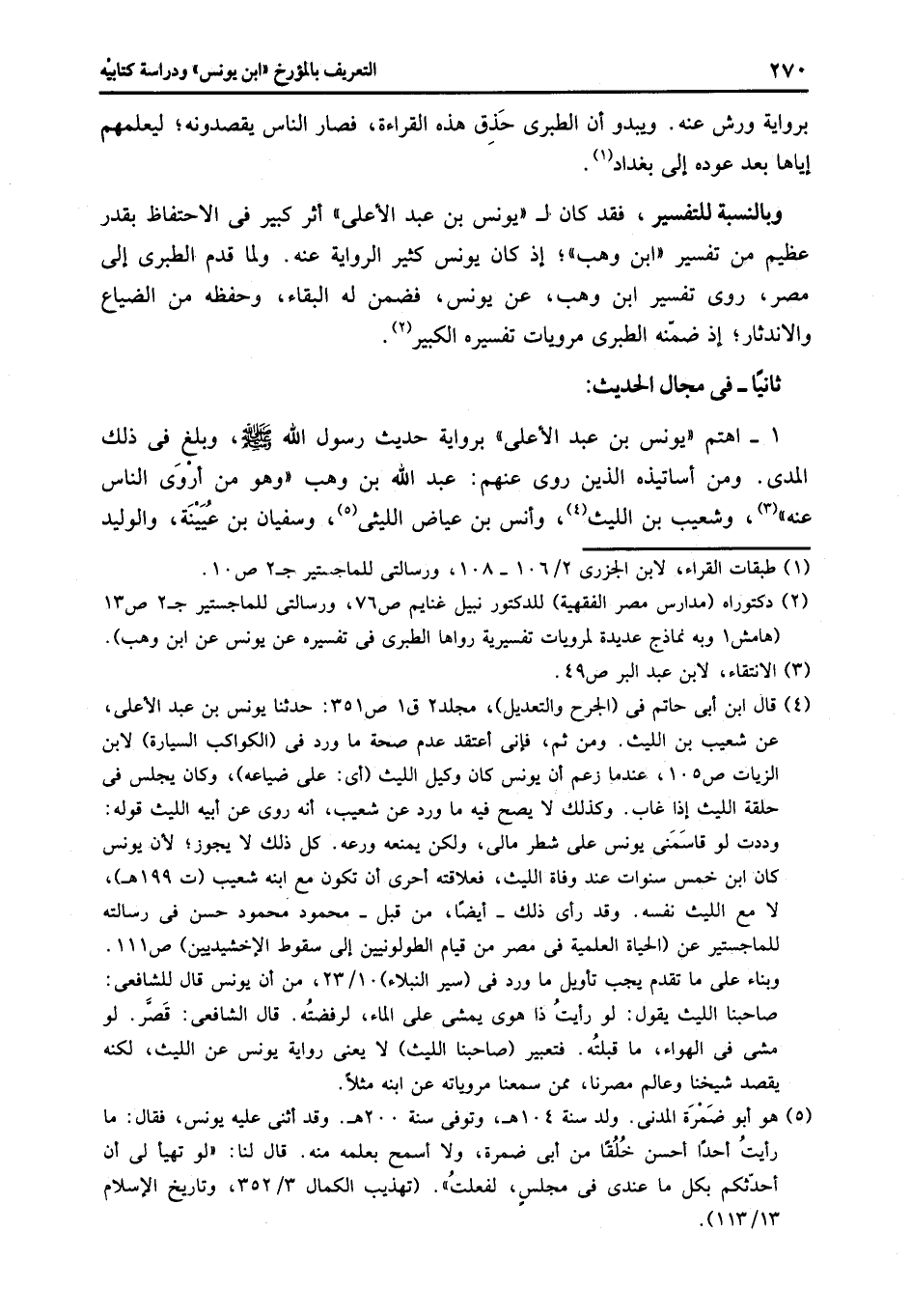 وبالنسبة للتفسير، فقد كان ل «يونس بن عبد الأعلى» أثر كبير فى الاحتفاظ بقدر عظيم من تفسير «ابن وهب» ؛ إذ كان يونس كثير الرواية عنه. ولما قدم الطبرى إلى مصر، روى تفسير ابن وهب، عن يونس، فضمن له البقاء، وحفظه من الضياع والاندثار؛ إذ ضمّنه الطبرى مرويات تفسيره الكبير «2» .