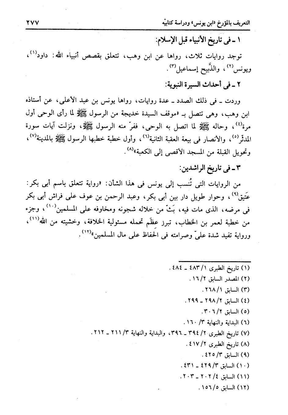عتيق «9» ، وحوار طويل دار بين أبى بكر، وعبد الرحمن بن عوف على فراش أبى بكر فى مرضه، الذي مات فيه، بثّ من خلاله شجونه ومخاوفه على المسلمين «10» ، وجزء من خطبة لعمر بن الخطاب، تبرز عظم تحمله مسئولية الخلافة، وخشيته من الله «11» ، ورواية تفيد شدة علىّ وصرامته فى الحفاظ على مال المسلمين» «12» .
