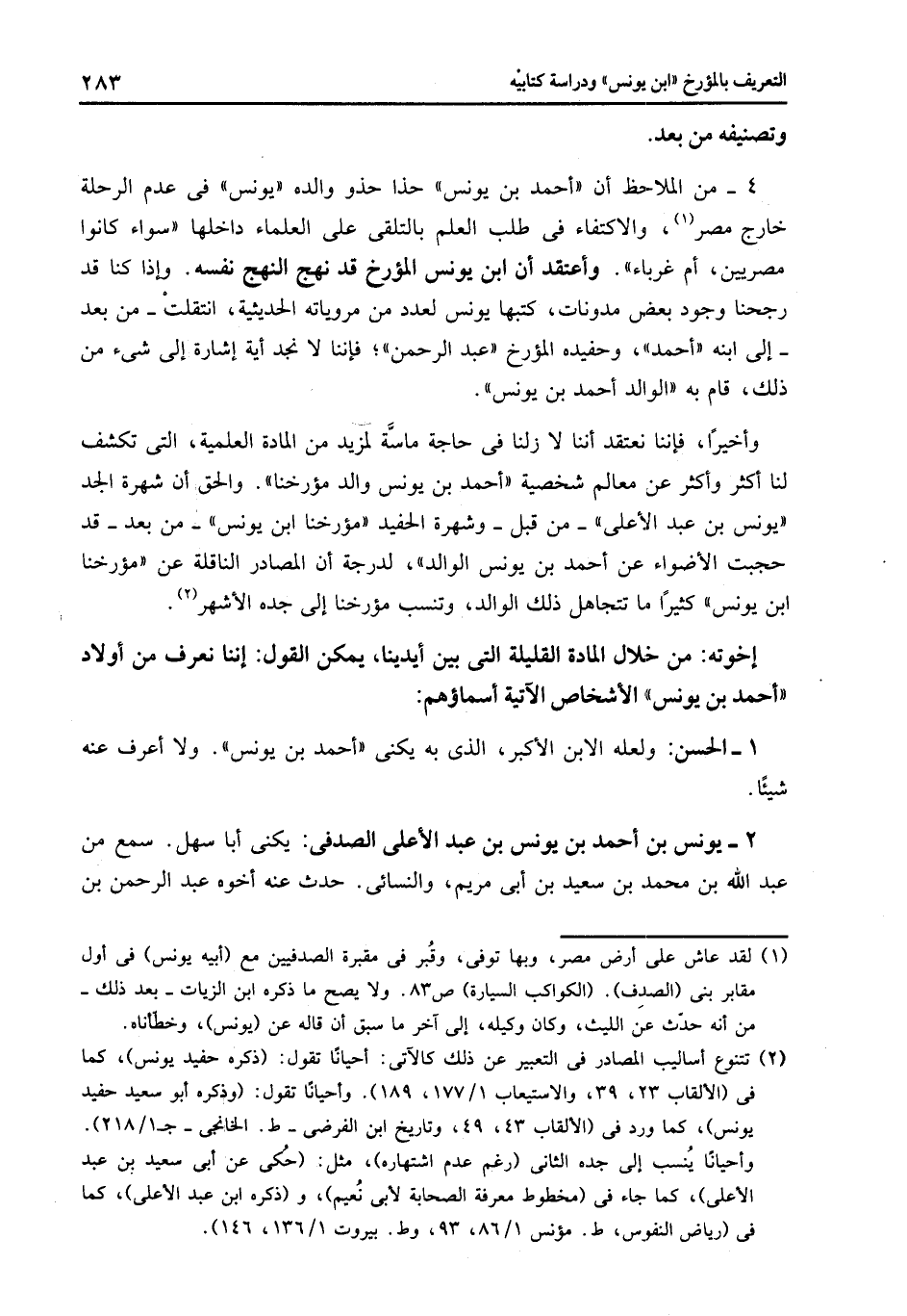 وأخيرا، فإننا نعتقد أننا لا زلنا فى حاجة ماسّة لمزيد من المادة العلمية، التى تكشف لنا أكثر وأكثر عن معالم شخصية «أحمد بن يونس والد مؤرخنا» . والحق أن شهرة الجد «يونس بن عبد الأعلى» - من قبل- وشهرة الحفيد «مؤرخنا ابن يونس» - من بعد- قد حجبت الأضواء عن أحمد بن يونس الوالد» ، لدرجة أن المصادر الناقلة عن «مؤرخنا ابن يونس» كثيرا ما تتجاهل ذلك الوالد، وتنسب مؤرخنا إلى جده الأشهر «2» .