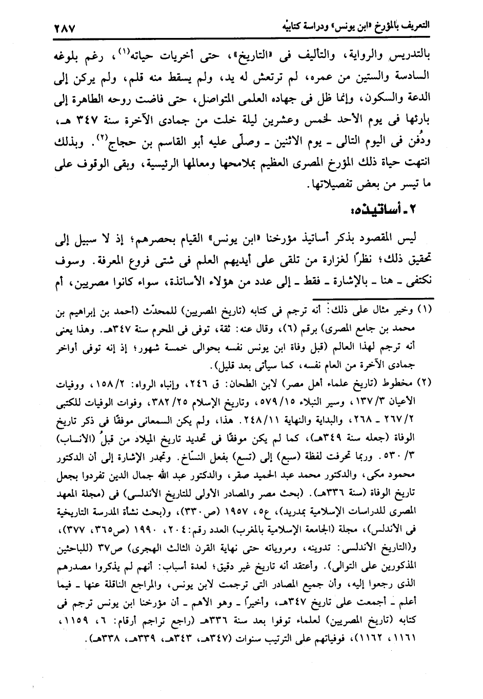 بالتدريس والرواية، والتأليف فى «التاريخ» ، حتى أخريات حياته «1» ، رغم بلوغه السادسة والستين من عمره، لم ترتعش له يد، ولم يسقط منه قلم، ولم يركن إلى الدعة والسكون، وإنما ظل فى جهاده العلمى المتواصل، حتى فاضت روحه الطاهرة إلى بارئها فى يوم الأحد لخمس وعشرين ليلة خلت من جمادى الآخرة سنة 347 هـ، ودفن فى اليوم التالى- يوم الاثنين- وصلّى عليه أبو القاسم بن حجاج «2» . وبذلك انتهت حياة ذلك المؤرخ المصرى العظيم بملامحها ومعالمها الرئيسية، وبقى الوقوف على ما تيسر من بعض تفصيلاتها.