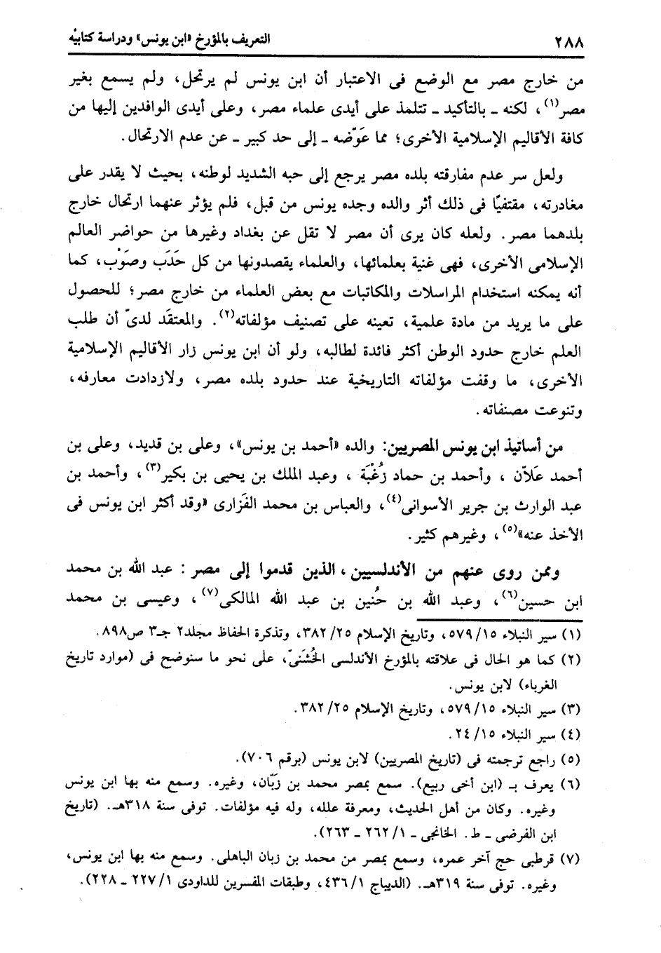 من خارج مصر مع الوضع فى الاعتبار أن ابن يونس لم يرتحل، ولم يسمع بغير مصر «1» ، لكنه- بالتأكيد- تتلمذ على أيدى علماء مصر، وعلى أيدى الوافدين إليها من كافة الأقاليم الإسلامية الأخرى؛ مما عوّضه- إلى حد كبير- عن عدم الارتحال.