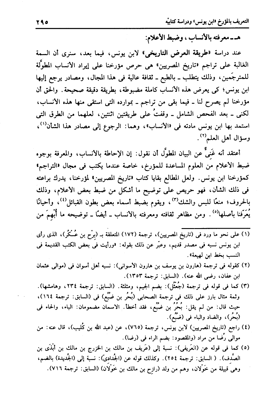 أعتقد أنه غنىّ عن البيان المطوّل أن نقول: إن الإحاطة بالأنساب، والمعرفة بوجوه ضبط الأعلام من العلوم المساعدة للمؤرخ، خاصة عندما يكتب فى مجال «التراجم» كمؤرخنا ابن يونس. ولعل المطالع بقايا كتاب «تاريخ المصريين» لمؤرخنا، يدرك براعته فى ذلك الشأن، فهو حريص على توضيح ما أشكل من ضبط بعض الأعلام، وذلك بالحروف؛ منعا للبس والشك «3» ، ويقوم بضبط أسماء بعض بطون القبائل «4» ، وأحيانا يعرّفنا بأصلها «5» . ومن مظاهر ثقافته ومعرفته بالأنساب- أيضا- توضيحه ما أبهم من