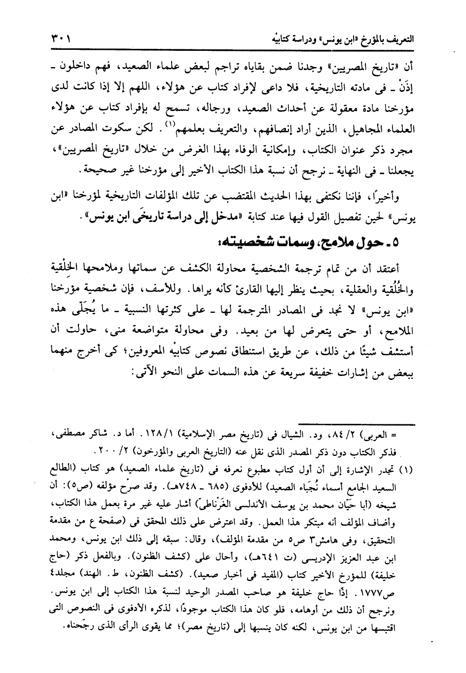 أن «تاريخ المصريين» وجدنا ضمن بقاياه تراجم لبعض علماء الصعيد، فهم داخلون- إذن- فى مادته التاريخية، فلا داعى لإفراد كتاب عن هؤلاء، اللهم إلا إذا كانت لدى مؤرخنا مادة معقولة عن أحداث الصعيد، ورجاله، تسمح له بإفراد كتاب عن هؤلاء العلماء المجاهيل، الذين أراد إنصافهم، والتعريف بعلمهم «1» . لكن سكوت المصادر عن مجرد ذكر عنوان الكتاب، وإمكانية الوفاء بهذا الغرض من خلال «تاريخ المصريين» ، يجعلنا- فى النهاية- نرجح أن نسبة هذا الكتاب الأخير إلى مؤرخنا غير صحيحة.
