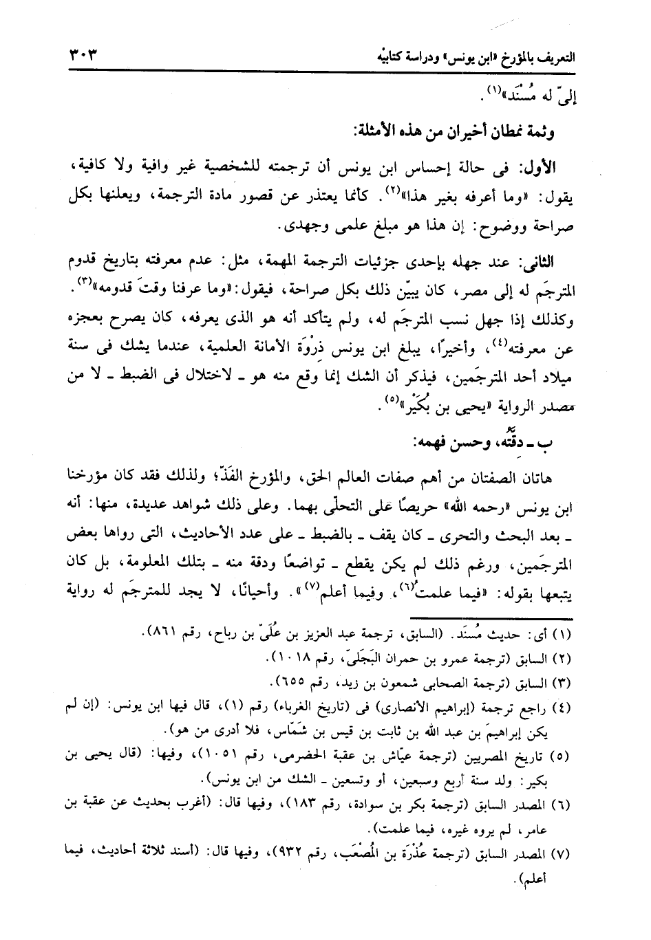 وكذلك إذا جهل نسب المترجم له، ولم يتأكد أنه هو الذي يعرفه، كان يصرح بعجزه عن معرفته «4» ، وأخيرا، يبلغ ابن يونس ذروة الأمانة العلمية، عندما يشك فى سنة ميلاد أحد المترجمين، فيذكر أن الشك إنما وقع منه هو- لاختلال فى الضبط- لا من مصدر الرواية «يحيى بن بكير» «5» .
