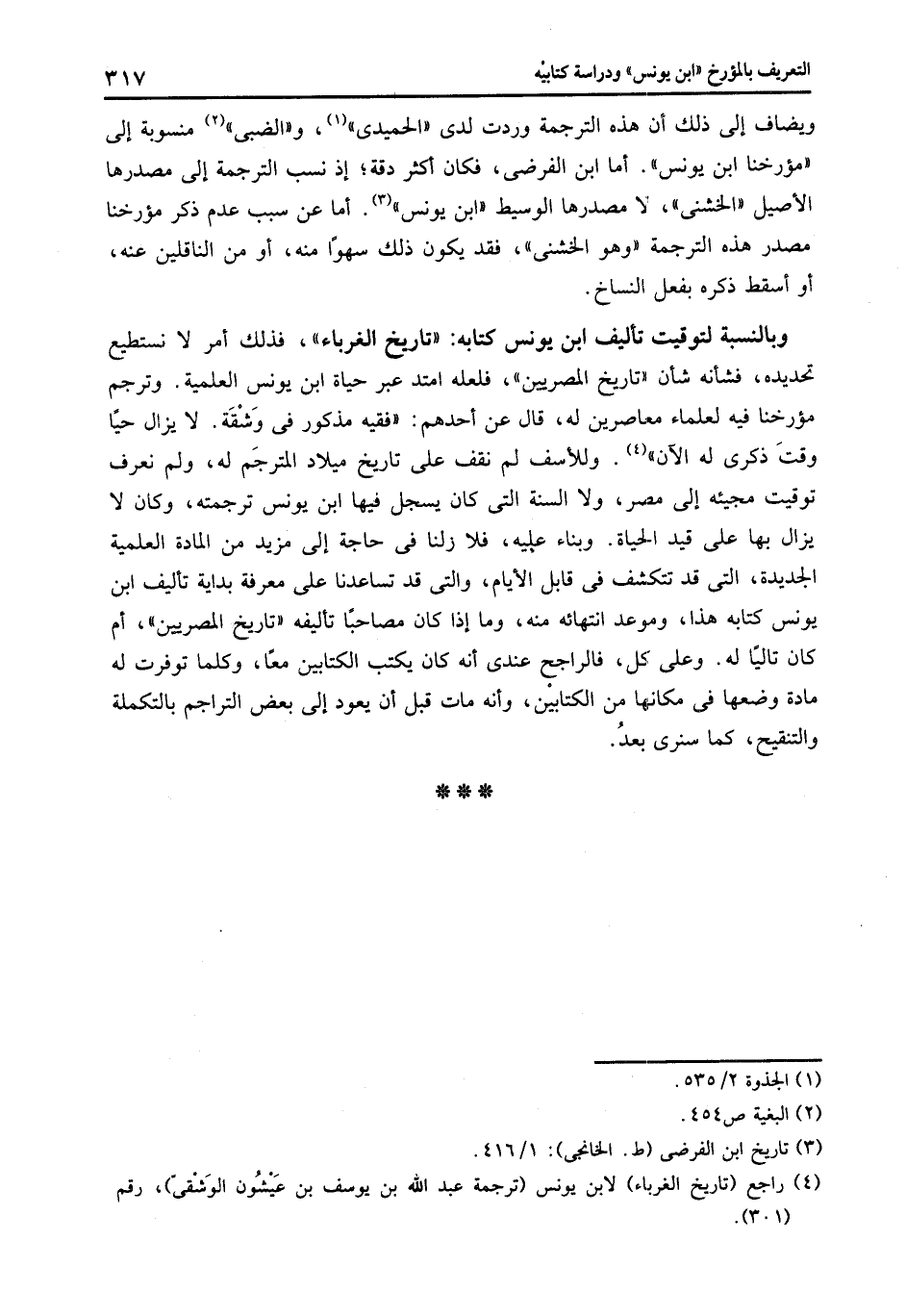 ويضاف إلى ذلك أن هذه الترجمة وردت لدى «الحميدى» «1» ، و «الضبى» «2» منسوبة إلى «مؤرخنا ابن يونس» . أما ابن الفرضى، فكان أكثر دقة؛ إذ نسب الترجمة إلى مصدرها الأصيل «الخشنى» ، لا مصدرها الوسيط «ابن يونس» «3» . أما عن سبب عدم ذكر مؤرخنا مصدر هذه الترجمة «وهو الخشنى» ، فقد يكون ذلك سهوا منه، أو من الناقلين عنه، أو أسقط ذكره بفعل النساخ.