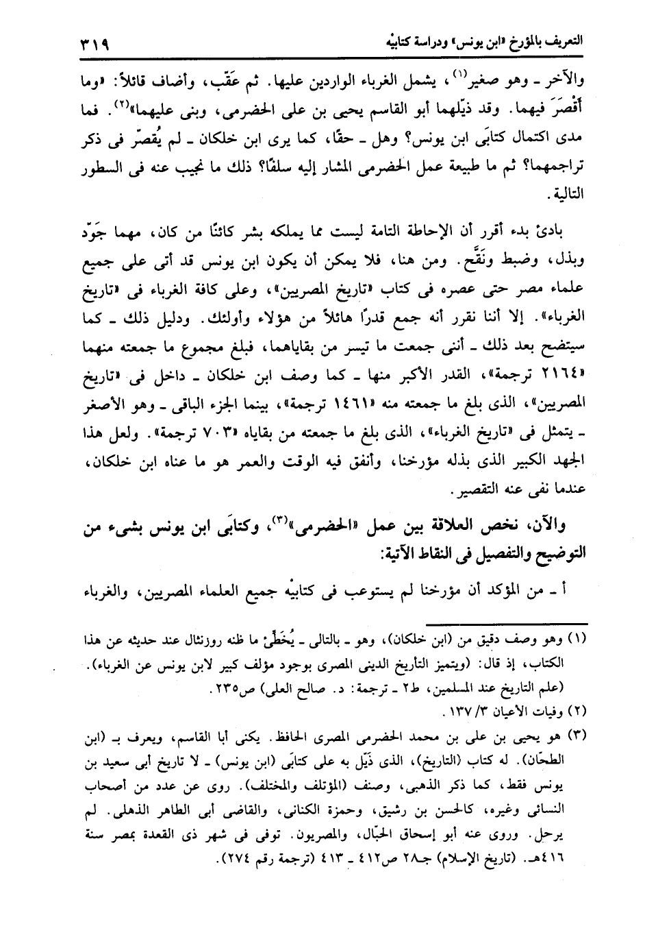 والآخر- وهو صغير «1» ، يشمل الغرباء الواردين عليها. ثم عقّب، وأضاف قائلا: «وما أقصر فيهما. وقد ذيّلهما أبو القاسم يحيى بن على الحضرمى، وبنى عليهما» «2» . فما مدى اكتمال كتابى ابن يونس؟ وهل- حقا، كما يرى ابن خلكان- لم يقصّر فى ذكر تراجمهما؟ ثم ما طبيعة عمل الحضرمى المشار إليه سلفا؟ ذلك ما نجيب عنه فى السطور التالية.