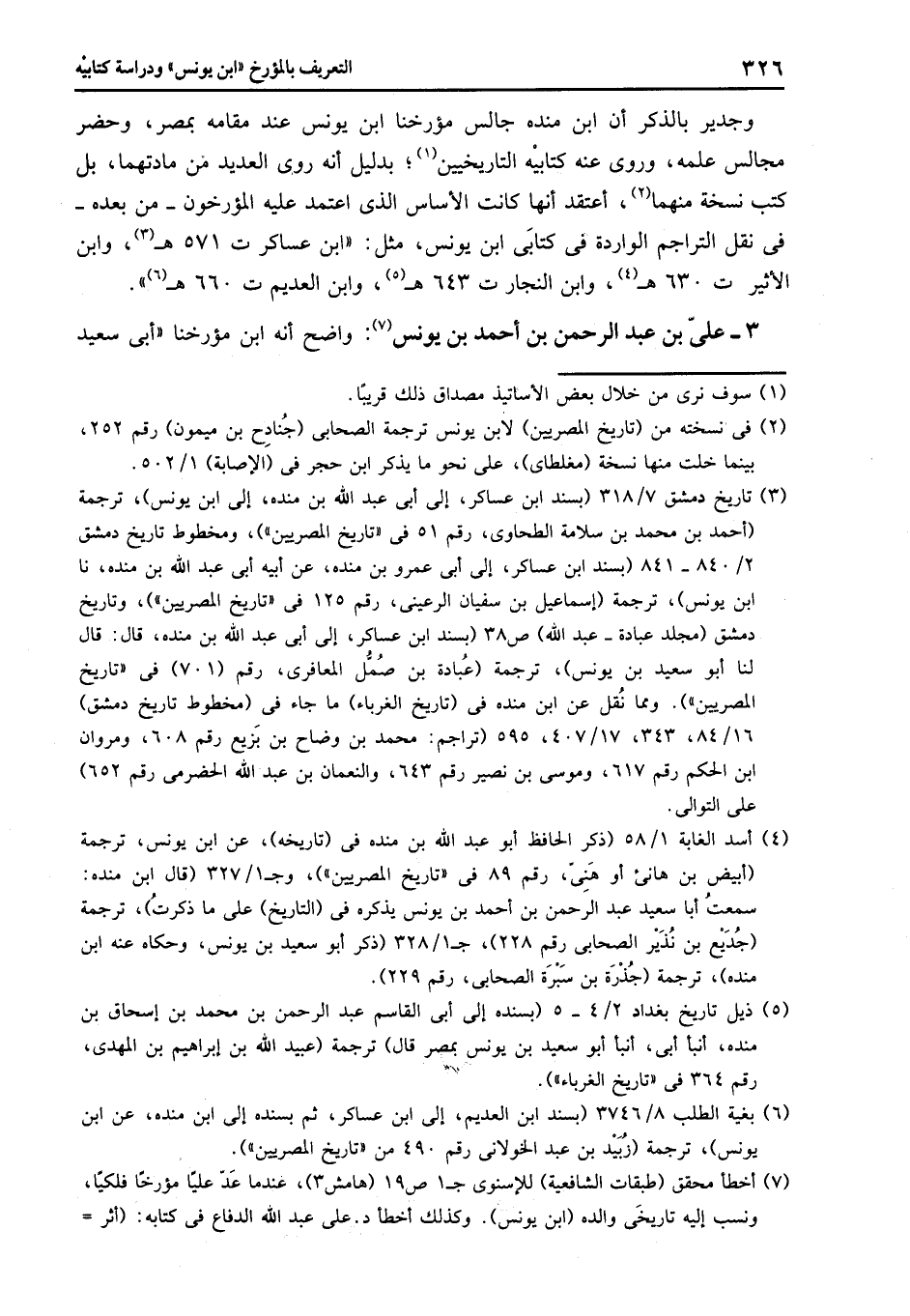 وجدير بالذكر أن ابن منده جالس مؤرخنا ابن يونس عند مقامه بمصر، وحضر مجالس علمه، وروى عنه كتابيه التاريخيين «1» ؛ بدليل أنه روى العديد من مادتهما، بل كتب نسخة منهما «2» ، أعتقد أنها كانت الأساس الذي اعتمد عليه المؤرخون- من بعده- فى نقل التراجم الواردة فى كتابى ابن يونس، مثل: «ابن عساكر ت 571 هـ «3» ، وابن الأثير ت 630 هـ «4» ، وابن النجار ت 643 هـ «5» ، وابن العديم ت 660 هـ «6» » .