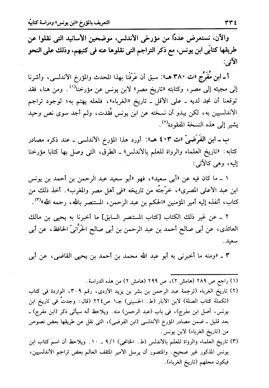والآن، نستعرض عددا من مؤرخى الأندلس، موضحين الأسانيد التى نقلوا عن طريقها كتابى ابن يونس، مع ذكر التراجم التى نقلوها عنه فى كتبهم، وذلك على النحو الآتى: