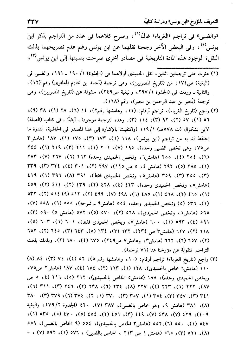 «والضبى» فى تراجم «الغرباء» غالبا «1» ، وصرح كلاهما فى عدد من التراجم بذكر ابن يونس «2» ، وفى البعض الآخر رجحنا نقلهما عن ابن يونس رغم عدم تصريحهما بذلك النقل؛ لوجود هذه المادة التاريخية فى مصادر أخرى صرحت بنسبتها إلى ابن يونس «3» ،