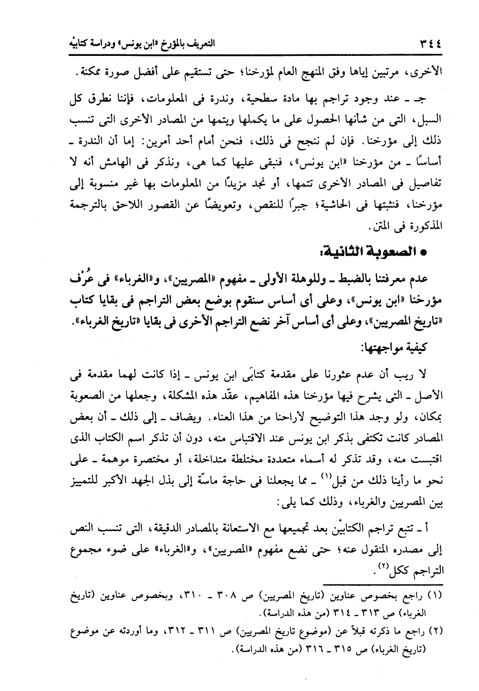 عدم معرفتنا بالضبط- وللوهلة الأولى- مفهوم «المصريين» ، و «الغرباء» فى عرف مؤرخنا «ابن يونس» ، وعلى أى أساس سنقوم بوضع بعض التراجم فى بقايا كتاب «تاريخ المصريين» ، وعلى أى أساس آخر نضع التراجم الأخرى فى بقايا «تاريخ الغرباء» .