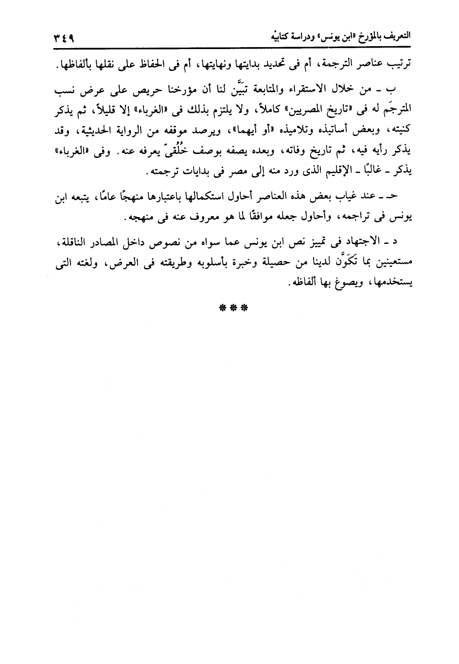 د- الاجتهاد فى تمييز نص ابن يونس عما سواه من نصوص داخل المصادر الناقلة، مستعينين بما تكوّن لدينا من حصيلة وخبرة بأسلوبه وطريقته فى العرض، ولغته التى يستخدمها، ويصوغ بها ألفاظه.
