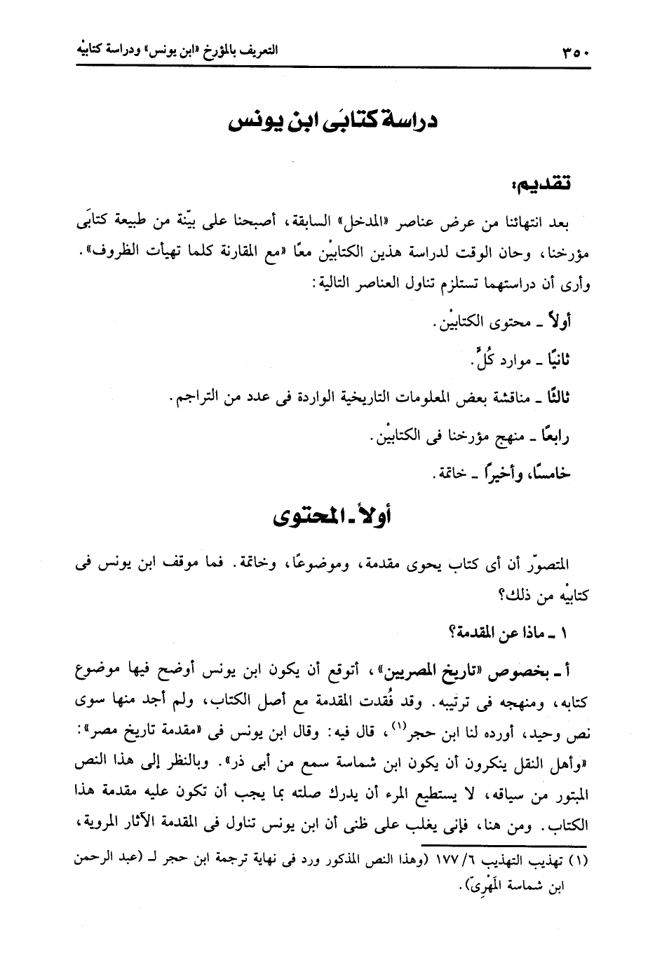 «وأهل النقل ينكرون أن يكون ابن شماسة سمع من أبى ذر» . وبالنظر إلى هذا النص المبتور من سياقه، لا يستطيع المرء أن يدرك صلته بما يجب أن تكون عليه مقدمة هذا الكتاب. ومن هنا، فإنى يغلب على ظنى أن ابن يونس تناول فى المقدمة الآثار المروية،