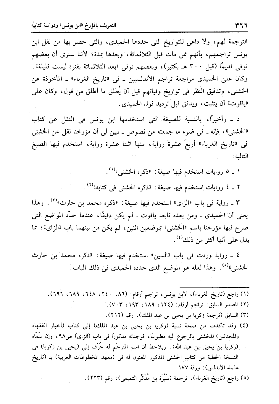 د- وأخيرا، بالنسبة للصيغة التى استخدمها ابن يونس فى النقل عن كتاب «الخشنى» ، فإنه- فى ضوء ما جمعته من نصوص- تبين لى أن مؤرخنا نقل عن الخشنى فى «تاريخ الغرباء» أربع عشرة رواية، منها اثنتا عشرة رواية، استخدم فيها الصيغ التالية: