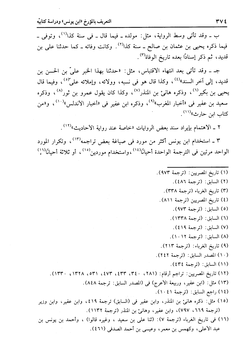 3- استخدام ابن يونس أكثر من مورد فى صياغة بعض تراجمه «13» ، وتكرار المورد الواحد مرتين فى الترجمة الواحدة أحيانا «14» ، واستخدام موردين «15» ، أو ثلاثة أحيانا «16» ،