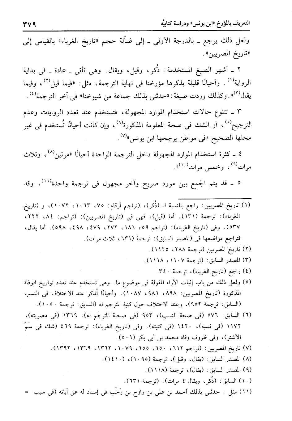 3- تتنوع حالات استخدام الموارد المجهولة، فتستخدم عند تعدد الروايات وعدم الترجيح «5» ، أو الشك فى صحة المعلومة المذكورة «6» ، وإن كانت أحيانا تستخدم فى غير محلها الصحيح «فى مواطن يرجحها ابن يونس» «7» .
