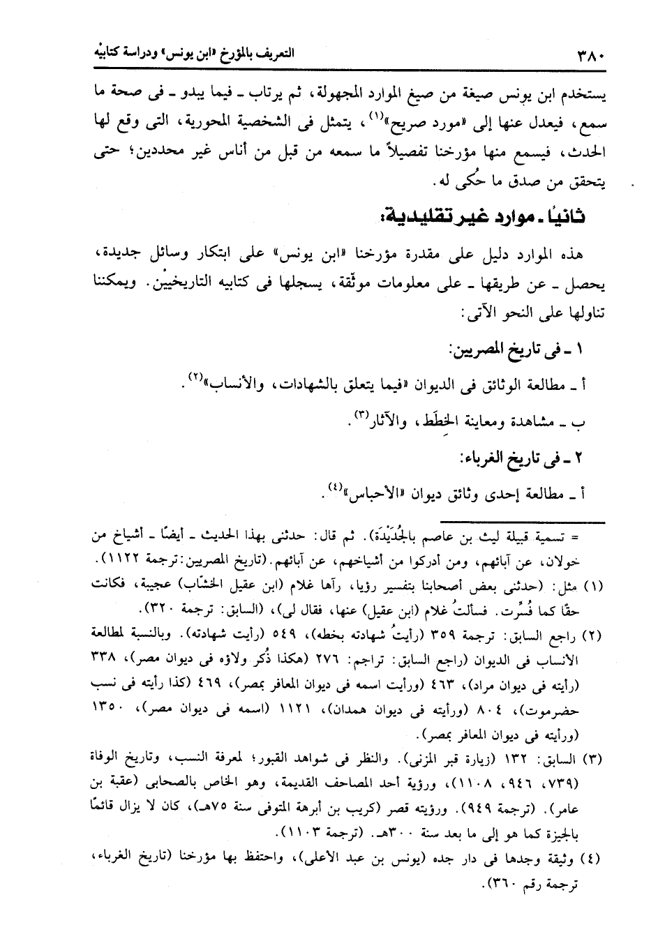 يستخدم ابن يونس صيغة من صيغ الموارد المجهولة، ثم يرتاب- فيما يبدو- فى صحة ما سمع، فيعدل عنها إلى «مورد صريح» «1» ، يتمثل فى الشخصية المحورية، التى وقع لها الحدث، فيسمع منها مؤرخنا تفصيلا ما سمعه من قبل من أناس غير محددين؛ حتى يتحقق من صدق ما حكى له.